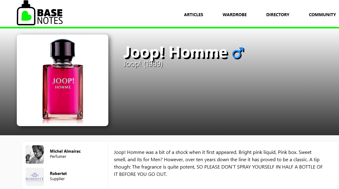 Joop! Homme Joop! Термоядерная бомба! Кому то она нравится, а кто-то ее терпеть не может, я из любителей таких парфюмерных извращений, что взял аж 200 мл. Это король вечеринок и клубов конца 80ых начала 90ых, он является прародителем Le Male Jean Paul Gaultier и Fleur du Mâle, вот откуда черпал вдохновение Kurkdjian. Без затеста не рекомендую.