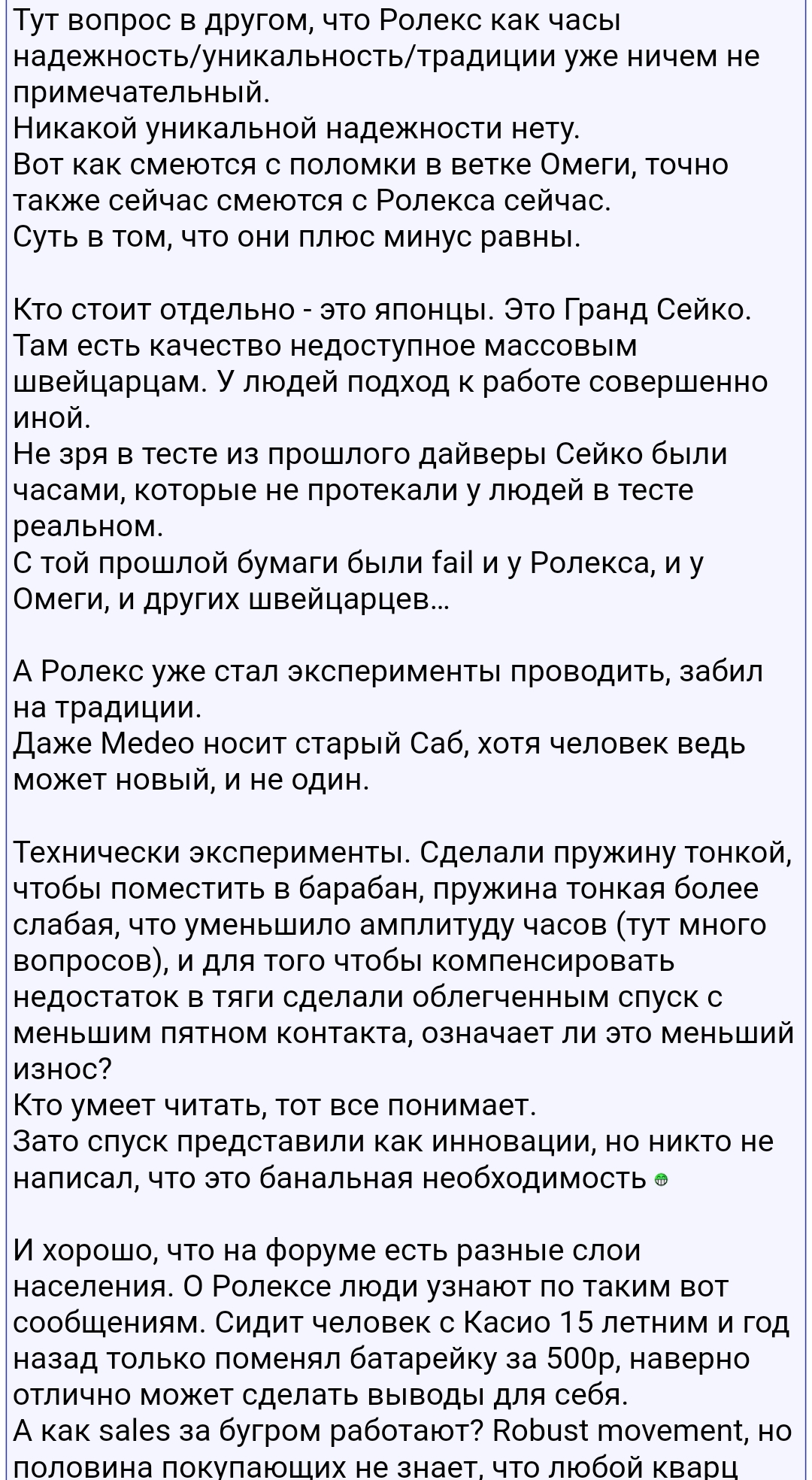 Для тебя слово пружинки это триггер или чё? Мне как то похуй на твоего протыка из будки. Не ну если у тебя припадок от таких слов то я могу изъясняться по доугому. Я говорю по факту что дешёвая механика это кал. Либо ты покупаешь ролих или омеги либо кварц. Я нищий для роликов поэтому для меня предпочтительней кварц. Я НЕ хочу дрочить заводную головку каждый день. Я про это уже расписывал подробно несколько трудов назад. Типа носил кварц а потом поносил механику и понял что дешманская механика, до пары тысяч евро, это неюзабельно. Вопросы? То что вы тут воюете с ветряными мельницами - мне похуй. Я тут недавно вообще, с декабря прошлого года так то сидел в часовых тредах в конце десятых годов но тогда я ещё был нищем студентом и приделом моих мечтаний были жишоки за пару тысяч срублей.