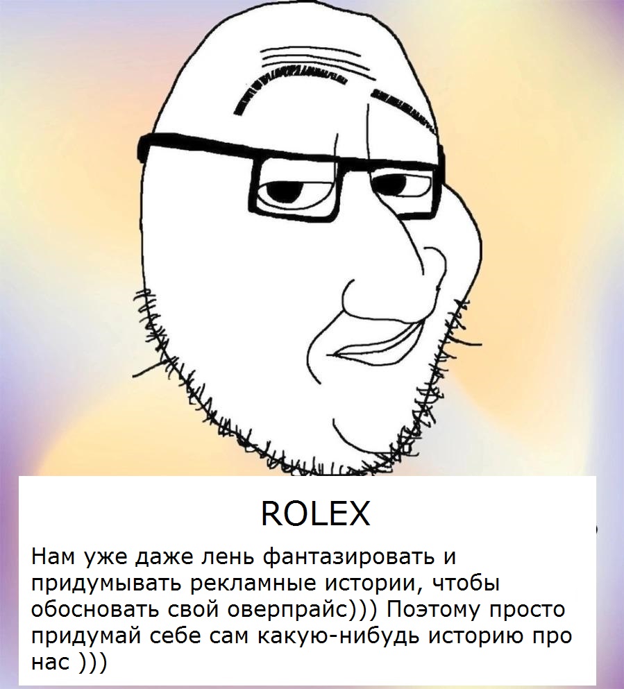 >>1876941 Был тут несчастный вляпавшийся в ролекс. Описывал как он суетился на полусогнутых перед продаваном, как смотрел преданным взглядом снизу вверх, чтобы у него изволили забрать бабки. Странные понты в общем, как-то не хочется таких. Впрочем, несчастный так и не понял почему над ним смеялись, возможно в его понимании сервильная суета и есть понты.