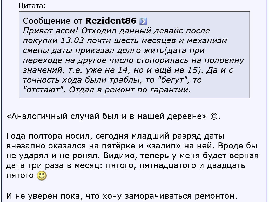 Но это только касаемо механики. Вот кварц же - другое дело! Его просто так не отремонтировать. То есть если механизм рабочий, то он и дальше будет работать, если механизм хуевничает, то он и при покупке будет хуевничать и ничего уже не сделаешь.