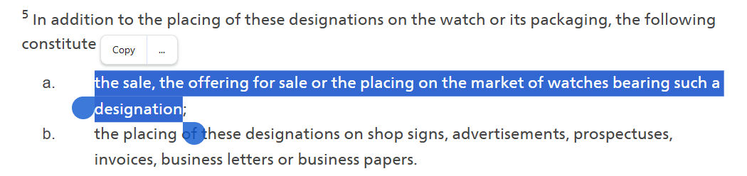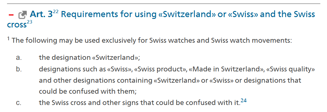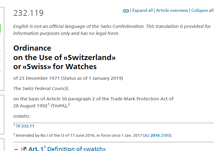 >>1879360 >Именно об этом и написано в статье закона на скрине. Там написано про маркировку самого товара. То есть про надпись, сделанную непосредственно на часах. А на сайте пишут, где они сделаны. В Швейцарии. Английским по белому. И ещё на многих европейских языках. У тебя есть иная информация?