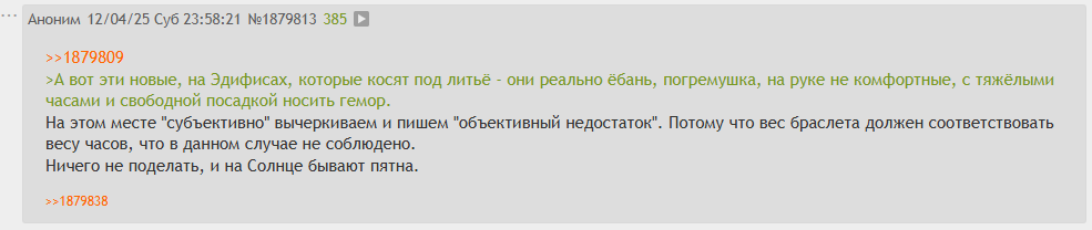 Двоемыслие горемычного разума это очень интересный феномен. Сначала пациент идёт покупать литой браслет на сасию, который даже по габаритам не подходит к ней, из-за чего горемычному папуасу приходится обтачивать звенья напильником, лишь бы подошло. Потом этот же пациент громогласно заявляет, что вес браслета должен соответствовать весу часов, нахваливая таким образом сасийную штамповку, от которой сам же и отказался. Это расстройство личности, или фрагментарное слабоумие? Призываю психиатр-куна для того, чтобы он смог выставить соответствующий диагноз.