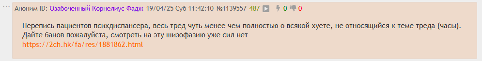 Не пойму че вы к пацану приебались. Пришел тихо-мирно, себя никак не афишировал. Показал часы, оставил отзыв и съебал. Да, немного дурачка включил, но без агрессии же. А жалкошизики сегодня так разошлись, что тред завайпали. Сегодня даже горемычный угол держит режим радиомолчания. Пиздец блядь.