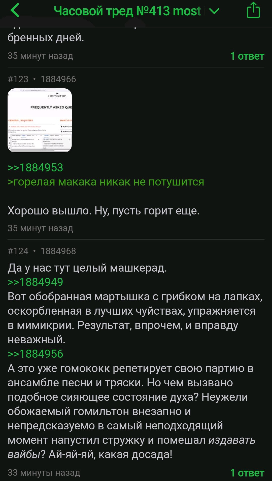 Да у нас тут целый машкерад. >>1884949 Вот обобранная мартышка с грибком на лапках, оскорбленная в лучших чуйствах, упражняется в мимикрии. Результат, впрочем, и вправду неважный. >>1884956 А это уже гомококк репетирует свою партию в ансамбле песни и тряски. Но чем вызвано подобное сияющее состояние духа? Неужели обожаемый гомильтон внезапно и непредсказуемо в самый неподходящий момент напустил стружку и помешал издавать вайбы? Ай-яй-яй, какая досада!