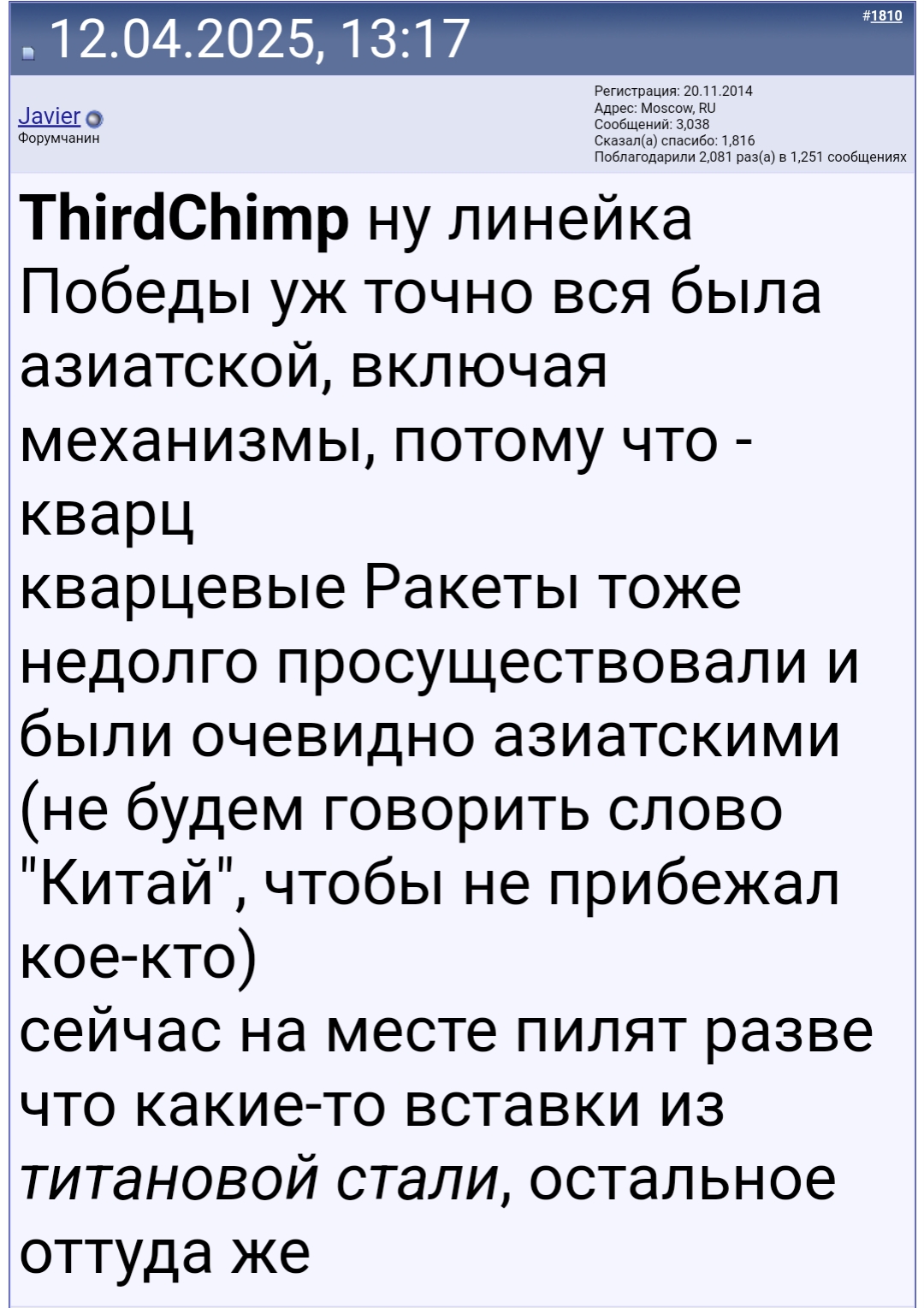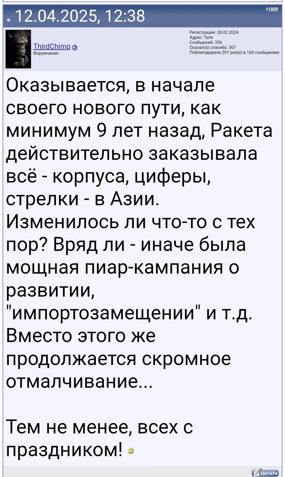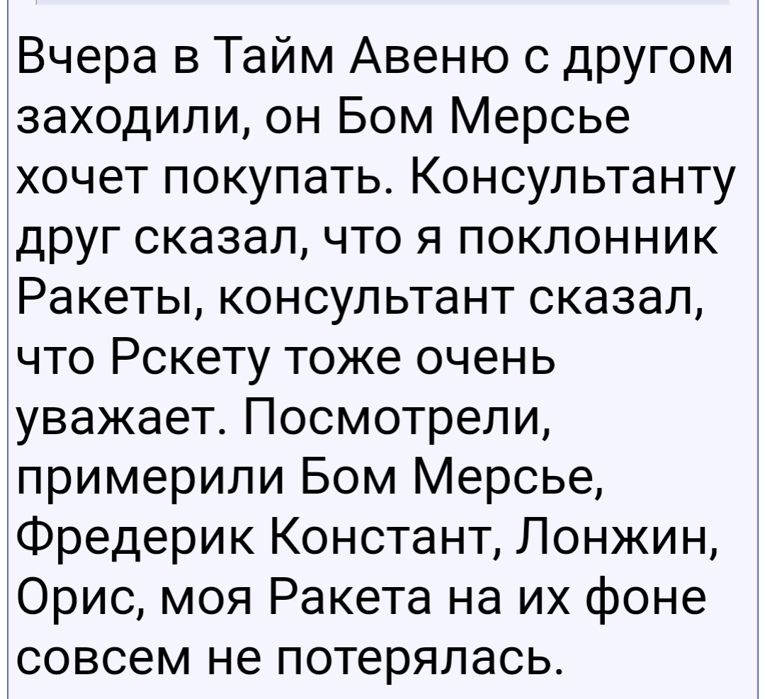 А вы что — до сих пор не поняли, что человек, который в 2025 году утверждает, что часы — инструмент да еще и для определения времени по определению адекватным быть не может? Что человек на доске про моду и стиль не имеет ни первого, ни второго. Тогда какие с ним разговоры могут быть? Только исключительно ради разведения срача и повышения постинга. КПД от общения с ним ноль.