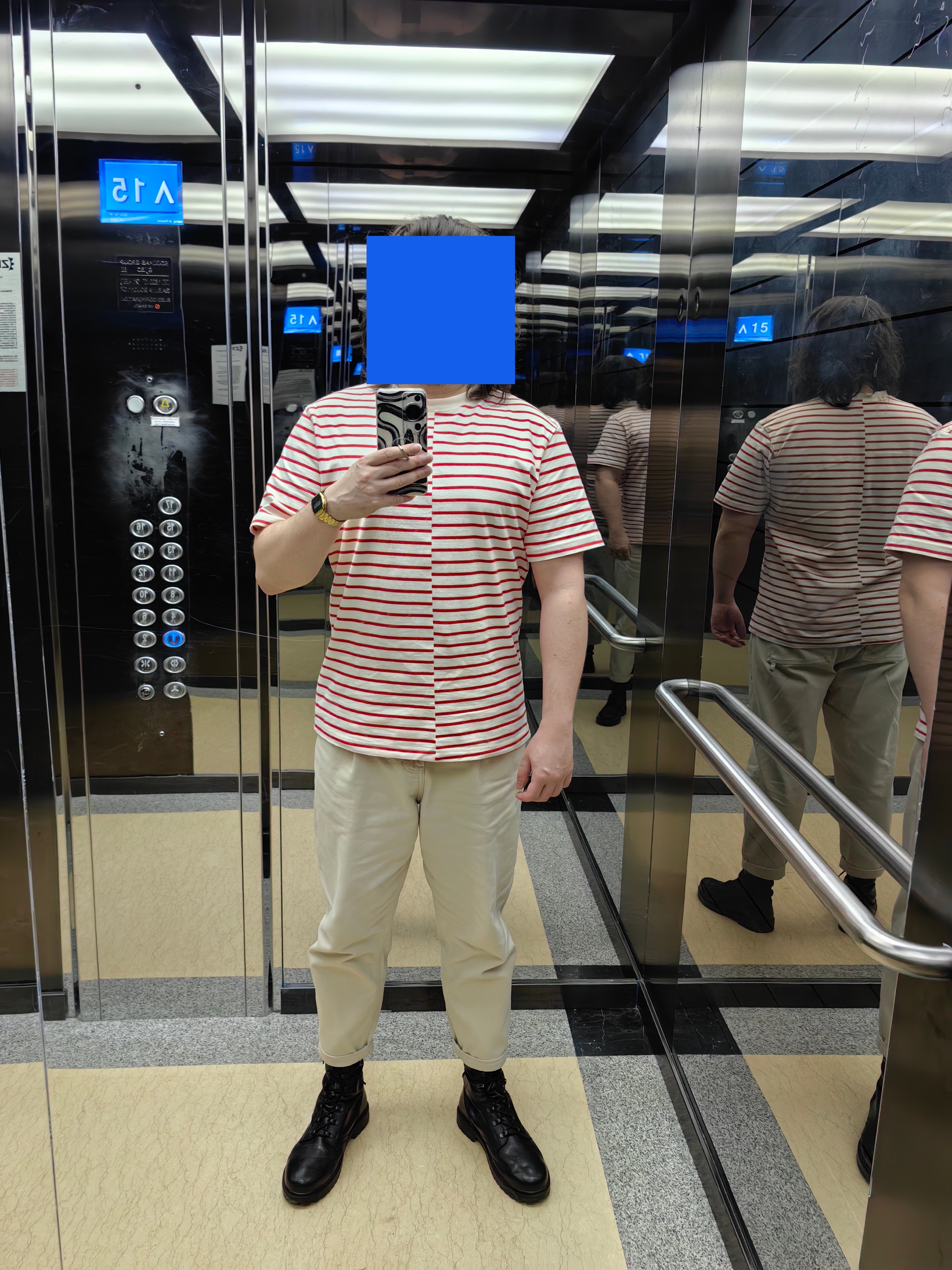 Вот тут если бы футболка была заправлена, было бы уже хорошо по пропорциям. И желательно ни эти веселые полоски.