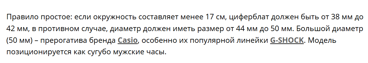 >>1891063 Есть дресс часы, для них диаметр меньше, есть кэжуал, для них диаметр больше. А бествотчу вообще в этом вопросе доверять не стоит. Если усредненно, то для среднего запястья дресс 38-39, для кэжуала 40-42. Для маленького запястья отнять пару миллиметров, для крупного прибавить.