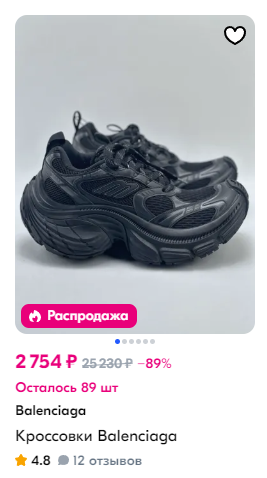 >>1871042 (OP) Кстати, зашел поискать на озоне Баленсиагу, удивился низким ценам. Шатны за 1.5 штуки рублей кроссовки за 3-5. Это получается какой-то дешманский бренд уровня срынка?