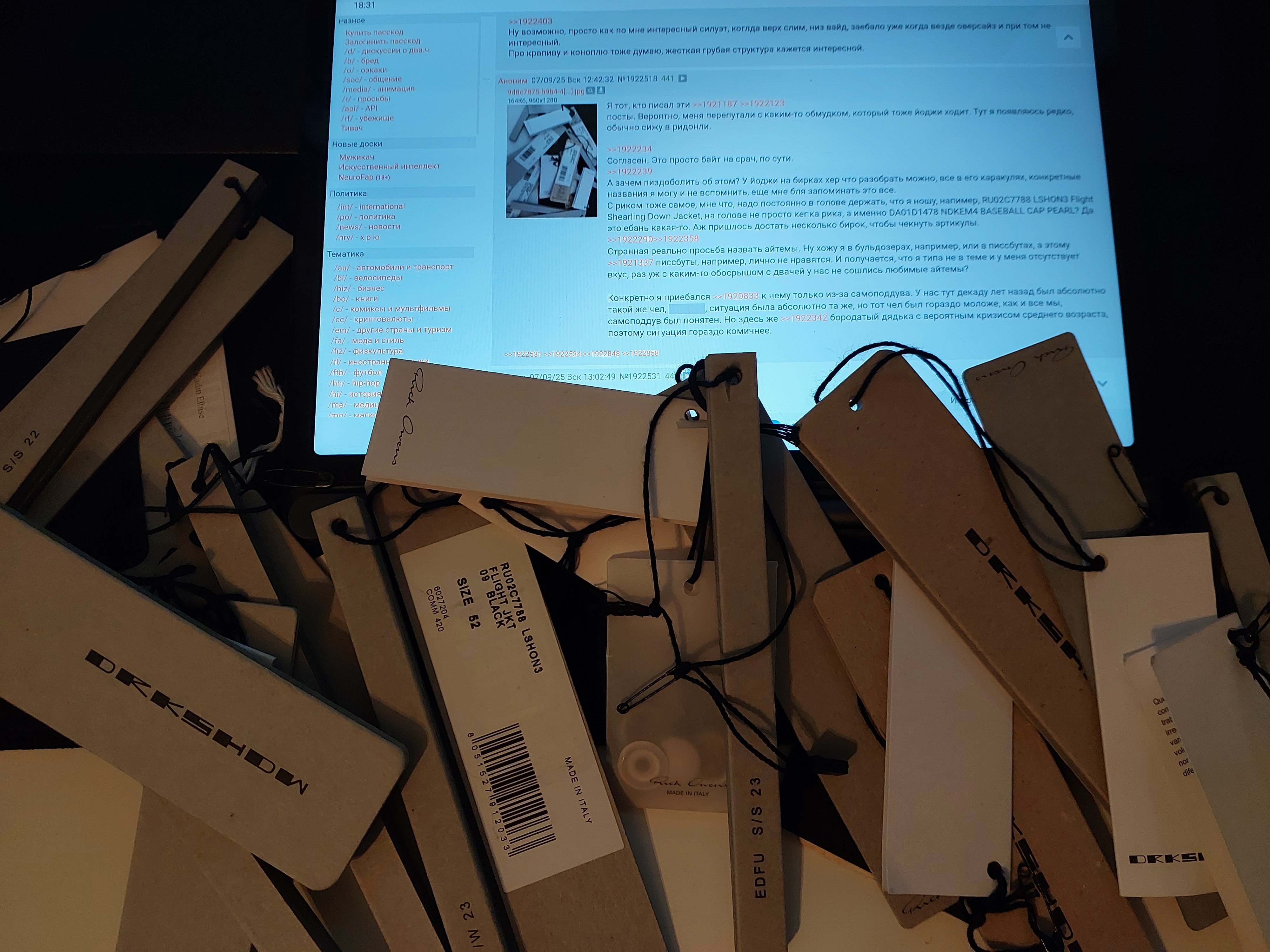 >>1923809 Потому что изначально разговор шел о том, что анон попросил названия любимых вещей назвать, а другой анон сказал, что это бессмысленно, и названия вещей сложно запомнить, т.к. артикулы очень заебистые, и привел в пример артикулы рика, сфоткав бирки своих вещей.