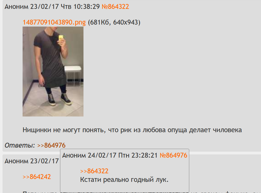 Все остальное они сказали какое-то пидорское для петухов, мужчин бы они за таких не считали если бы они так вырядялись. Т.е. мужскую одежду которая реально нравится девушкам, тут почему-то обсирают, но петушиное стараются хвалить. Это ведь реально пропаганда опидорености в треде идет полная
