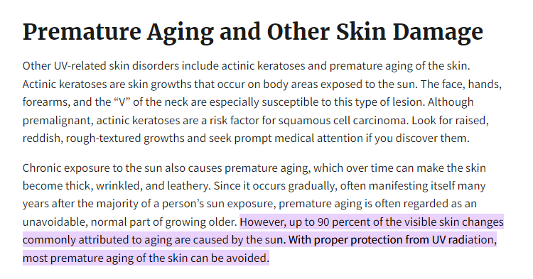 Или тупо сравни состояние своей кожи лица и тех частей тела, которые не облучаются солнцем. Например на кожау внутренней поверхности рук, которая сопоставима по толщине и структуре с кожей лица.