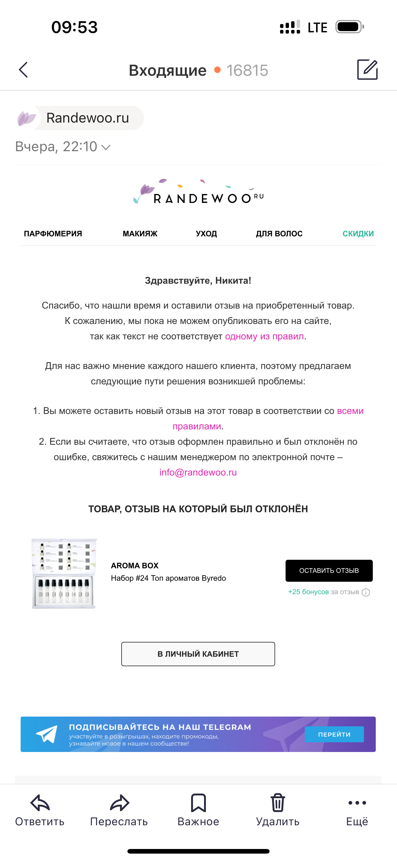 Ну я решил написать им отзыв, мол ребята - без обид, но содержимое вашего бокса сомнительно, вот аромат из известного офлайн магазина и отличия там кардинальные от композиции до ТТХ. На что, очевидно, местная моча потерла мой пост, выписав предупреждение, что про духи на рандеву - как про покойников - либо хорошо, либо ничего.