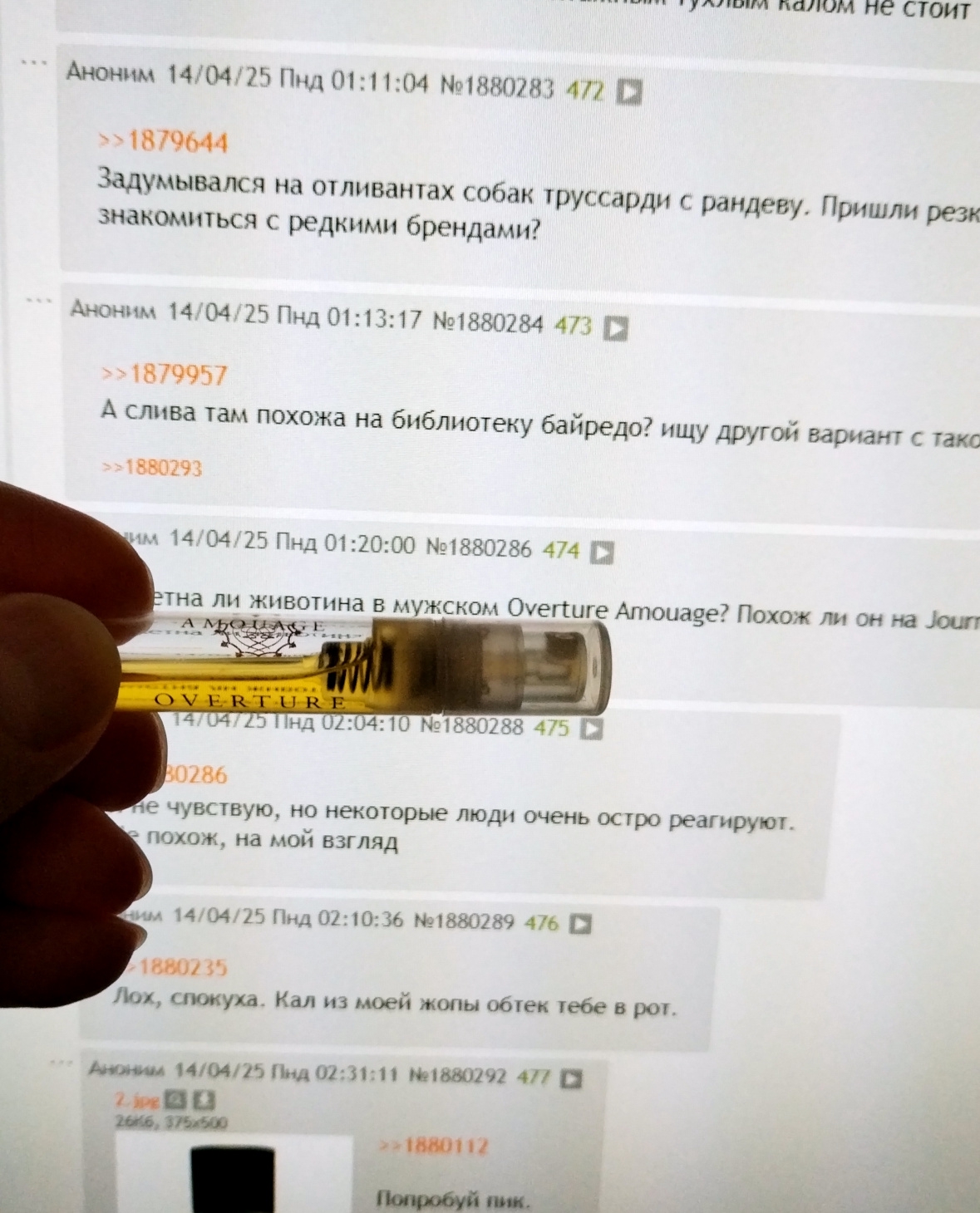 Ну и еще такой момент - аромат могло растрясти в отливанте, ему нужно отстояться (дада, бывает и такое!). Аромат мог натурально пропасть - хуй знает, в тепле под солнцем простоял, мог срок годности выйти (ну это больше к тем у которых масла в составе до усрачки напиханы - у меня Морф из РГ сдох за два года, воняет щас ебейшей химозой как изопропанол). Анон также писал здесь, что у него Афганец в жижу с черными комками говна превратился.