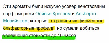 >>1881455 Долбоеб, давай без оскорблений. Статья явно взята не с потолка, а со всяких пресс-релизов бренда и верить или нет каждый сам для себя решает. Естественно что бренд всячески приукрашивает, но это его официальная информация. Тем более в таком тонком вопросе как парфюмерия, где на одном будет стойкость условно говоря день, а на другом - 1 час.