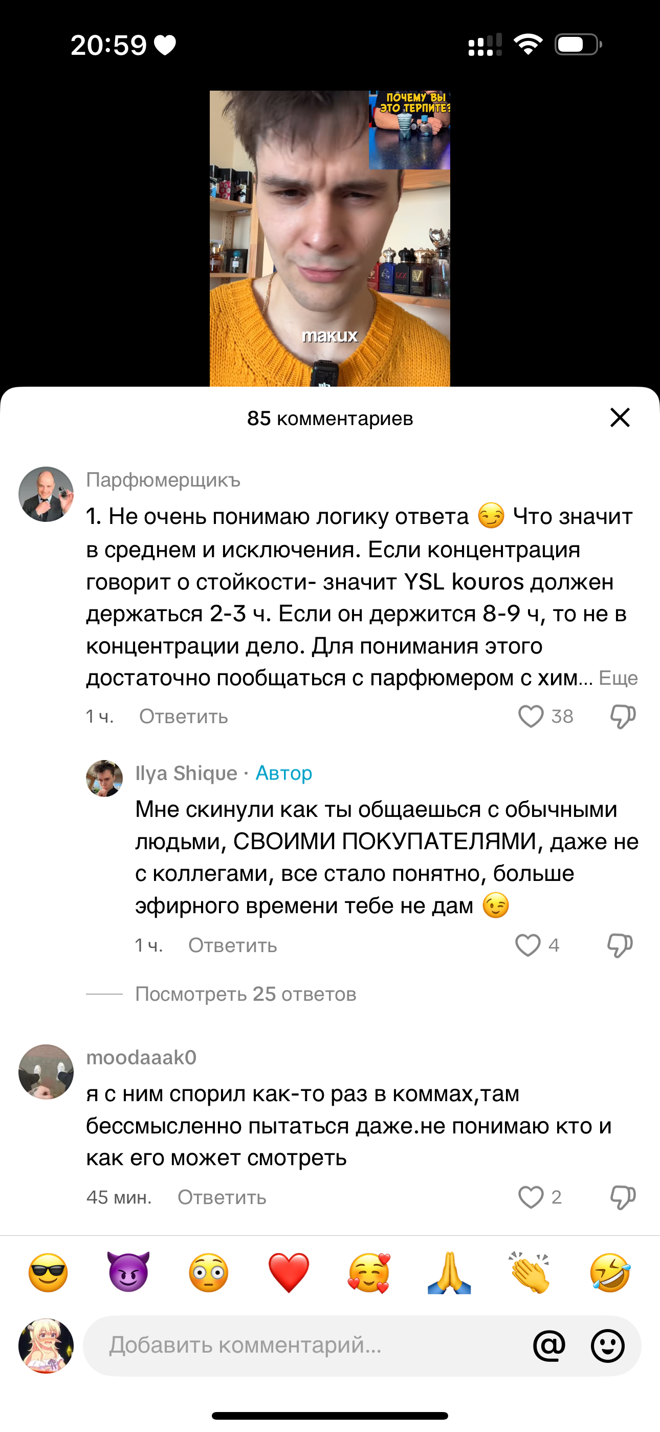 >Во всяком случае, к его мнению хотя бы имеет смысл прислушаться, если он говорит, что что то нравится телочкам Он так на любую мочу говорит. Что не видос то ОТЛИЧНЫЙ ПАРФЮМ КОМПЛИМЕНТАРНЫЙ. Комплиментошизы это отдельная каста ебанутых. Да, парфюм должен дополнять образ и нравиться ароматом, но брать его чисто чтобы тебе рандомы говорили что ты воняешь клево - шизофрения.
