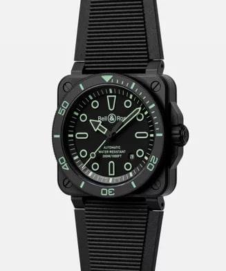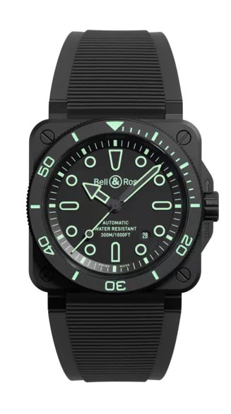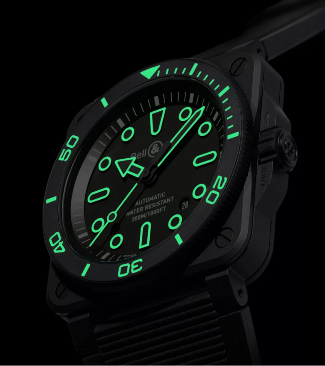 Принцип "less is more" (меньше — значит больше) находит свое подтверждение в новых часах BR-03 Diver Lum Outline от Bell & Ross. В отличие от практически полностью светящихся в темноте моделей бренда «Full Lum», где к часам прилагается люминесцентный каучуковый ремешок, в BR-03 внимание уделено отдельным деталям. Стрелки и индексы модели обведены зеленым Super-LumiNova®, создавая впечатление нарисованных флуоресцентным маркером в темноте.