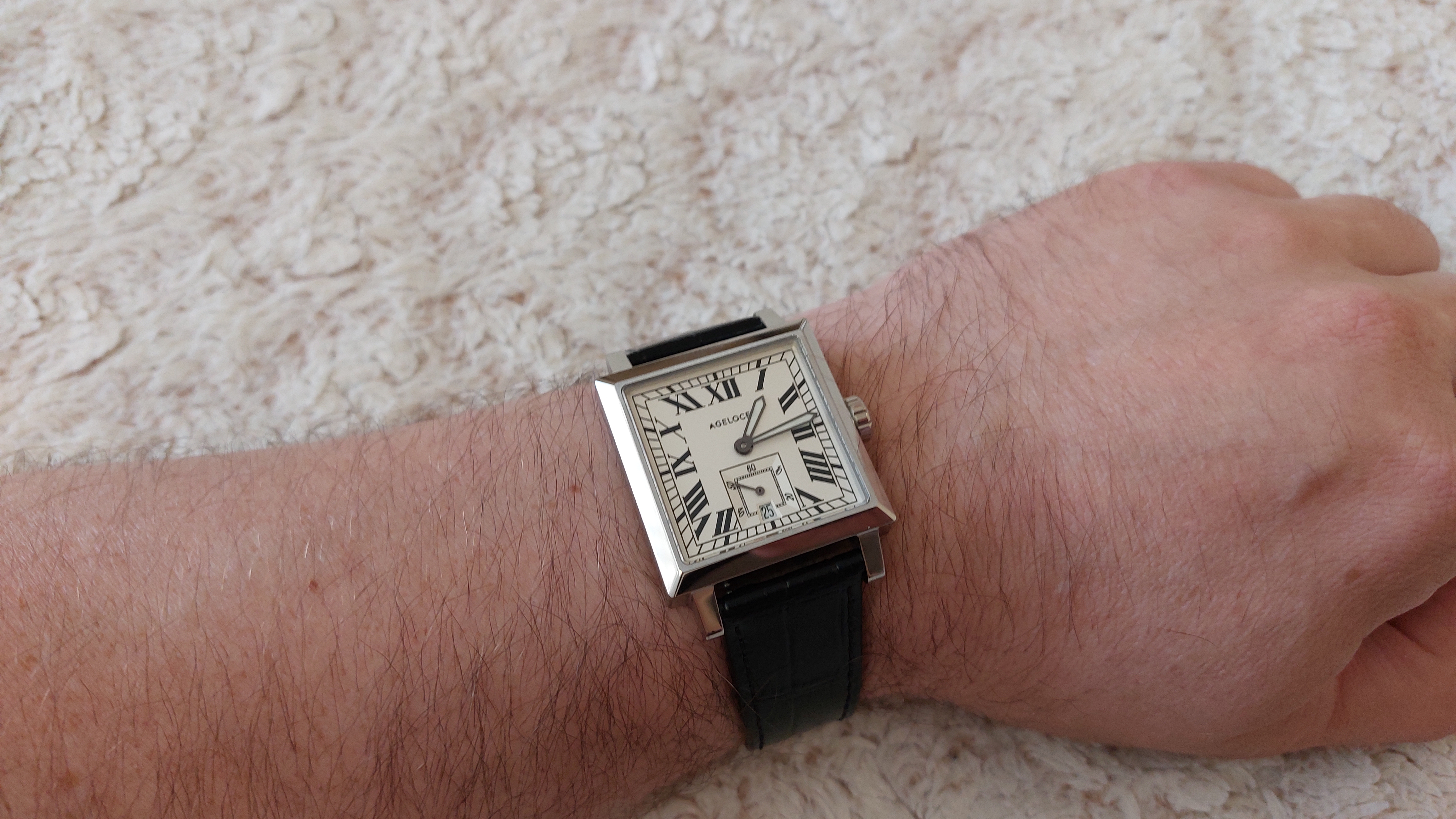 Купил себе квадратные agelocer. Модель понравилась. Есть несколько часов с Али, но все с темными циферами и на всех отвратительный антиблик. Поэтому их и не ношу. На этих же стекло не бликует. Возможно из-за светлого циферблата. Ремешок в комплекте отличного качества. Очень мягкий. Но я его уже заменил. Для меня слишком сильное сужение 22-16 и очень неудобная клипса - тяжело регулировать и неудобно открывать. Идут довольно точно. За неделю ни на минуту не отстали/убежали (а секунды я на механике не замеряю). Понравилось внимание к деталям, даже протирка имеет логотип. Покупкой очень доволен.