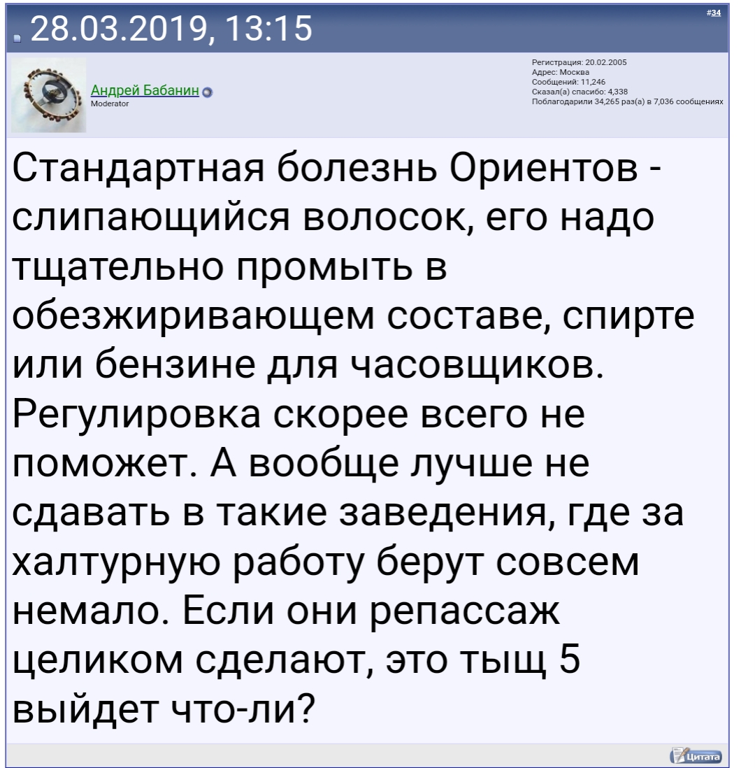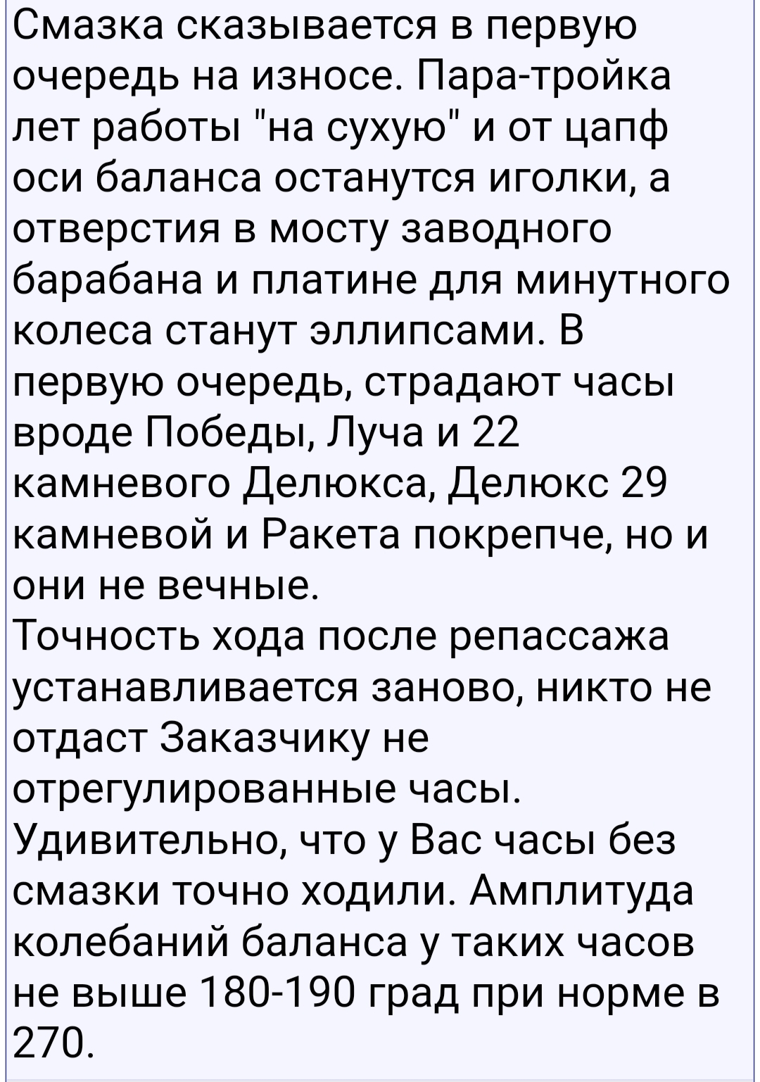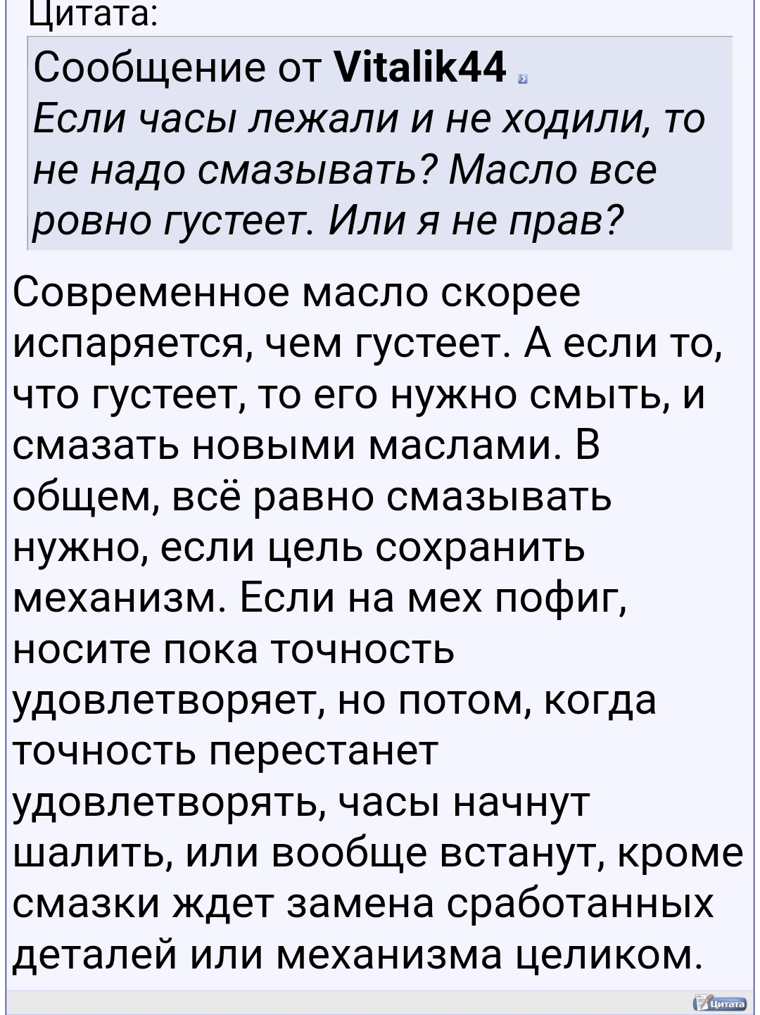 >>1899543 Пара вариантов 1. Работает - не трогай 2. Найди мастера на свой город. Такие обычно не находятся в тц, остановках и других скоплениях людей, работают спокойно в своих мастерских годами, а иной раз и поколениями, знают друг друга либо напрямую либо через руки, каста считай. По хорошему тебе надо масло заменить, но мастер точно скажет что, 25 лет это большой срок, но вроде 3 звезды славятся мощными мехами, тем более если и в коск идут. Стоимость не большая, особенно если это не дорогие часы, но мастеру в любом случае показать надо. Попробуй через 2 гис поискать.