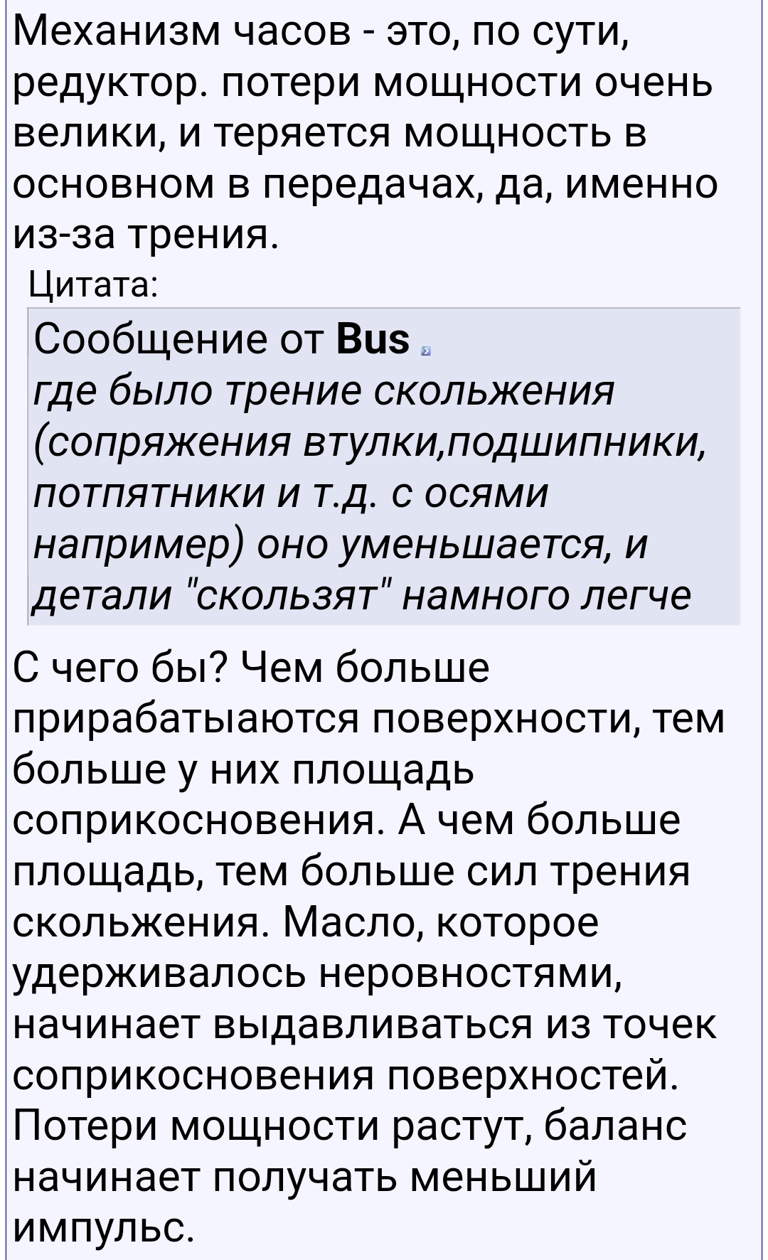 >>1900186 Мань, дело в трении. Посчитай сколько полуоборотов делает баланс в день и прикинь толщину его оси. Он движется не так часто, зато круглыми сутками на оси толщиной с иголку >>1900186 >есть надежные коробки, в которых масло не меняют десятилетиями, Только там детали в масло полностью погружены и имеют размер в сотни, если не тысячи раз больше,чем часовые оси. Да и в целом это тоже полубайки про то, что их можно не обслуживать