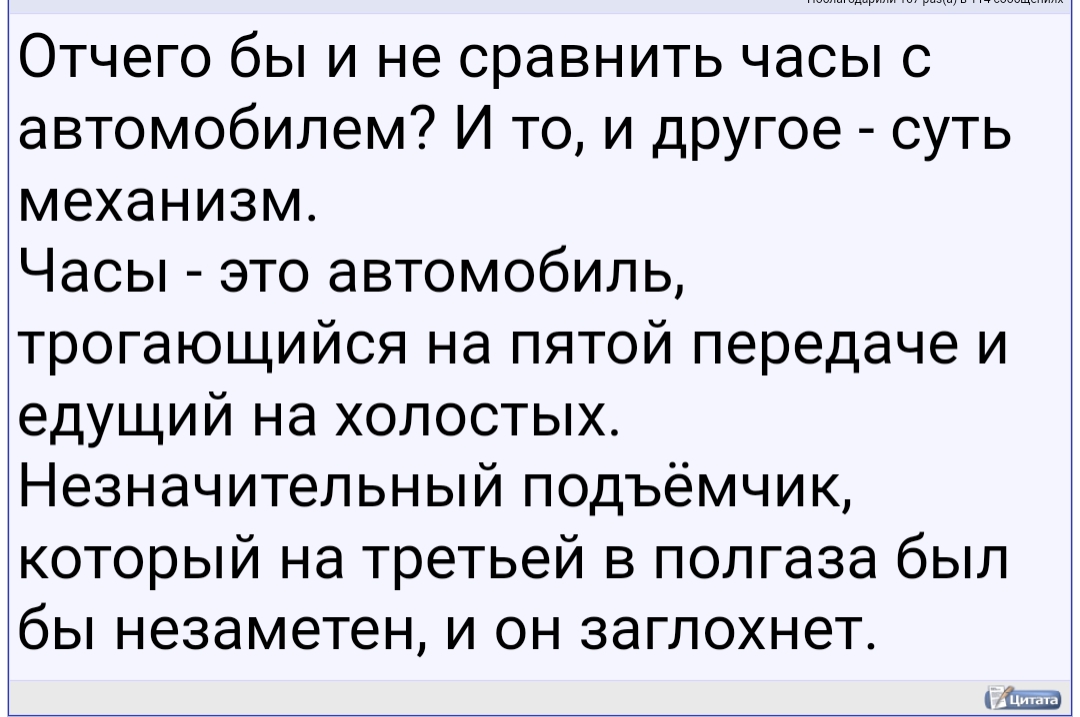 Да в целом дроч на цифры — бич часового энтузиазма и блогосферы сегодня. Тут вот шиз есть который на толщину прям дрочит, для него все толще сантиметра уже кастрюля и неносибельное говно. Дрочеров на атомную точность тоже целый выводок. Часы аксессуар очень индивидуальный и главный критерий качества по сути — это эмоциональный заряд который они тебе дают, будь это какая-то особая память о человеке или событии, радость от владения дорогой/старой/сложной/качественной и при этом сугубо опциональной вещью, абстрактный вайб, и т.п. По себе могу сказать, у меня сейка с безелем, но они вроде как известны что он у них не самый лучший, скажем так. При этом часы я люблю, и безелем пользуюсь постоянно - по нему удобно всякие пельмени-макарошки засекать, ну и в целом покрутить пощелкать иногда приятно. Конечно, если тебе попадется какой-то очевидный брак, типа слишком тугого или вообще не попадающего в отметки — будет неприятно. Но это отдельная история.