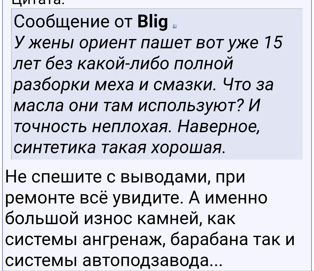 >>1900141 >Всё прекрасно понимаю Т.е. оси не истираются без смазки или что? >>1900141 >Покажи мне отзывы владельцев ориентов на 469 или родственном мехе, жалующихся на частые ремонты и общую ненадёжность механизма Покажи мне статистику, доказывающую,что мехи можно не обслуживать >>1900141 >469 же прост и надёжен, Если его обслуживать. И он совсем не прост по сравнению с тем же 2609. Ты бы хоть на него ыапал