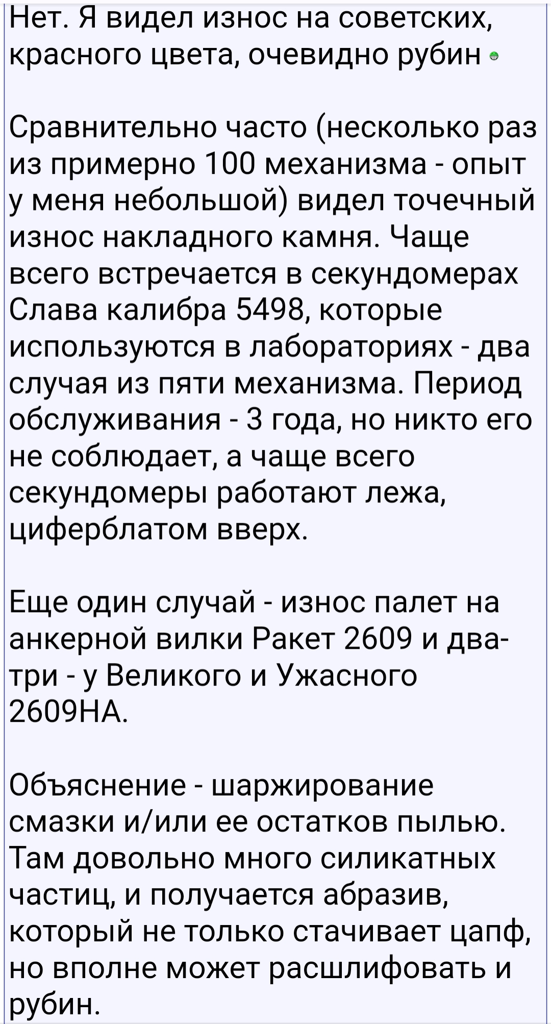 >>1900201 Кварцу по хорошему тоже смазку делать надо, только там нет такого быстрого вращения как у баланса и таких тонких осей. Но поскольку механизмы дешёвые на это забивают. >>1900201 >Так и нагрузки там совсем смешные. Сколько этот баланс весит, хуй да нихуя? Он там винтами прижат, не своим весом давит. Найди уже видео от часовщиков да посмотри реальную выработку