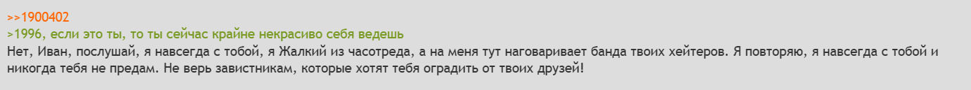 >>1901473 Вот поэтому, чтобы такой хуйни не было, на доске должна быть обязательная идентификация постеров с помощью трипкодов или иных методов. Каждого поста, в обязательном порядке.