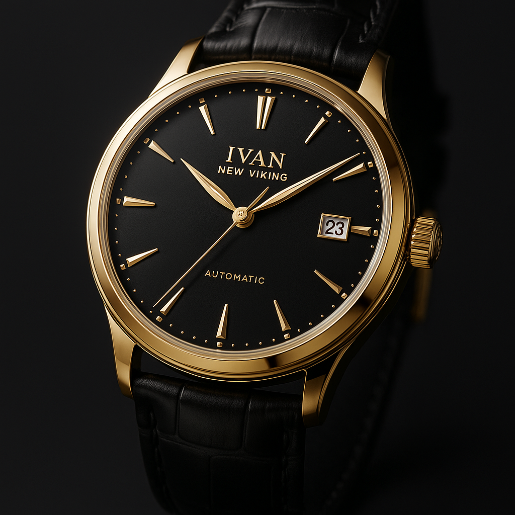 Видео открывается крупным планом, где солнечные лучи мягко освещают корпус часов Ivan New Viking, отбрасывая элегантные отблески на золотой безель и черный циферблат. Голос за кадром (бархатный, уверенный): "Время не ждёт. Оно ценит тех, кто умеет его ценить." В следующем кадре мужчина в строгом костюме застёгивает часы на руке перед важной встречей, а женщина в вечернем платье настраивает их перед светским раутом. Фоновая музыка – классический джазовый ритм. Голос за кадром: "Ivan New Viking — шедевр мастерства, стиль вне времени." Крупный план механизма часов с тонкой гравировкой, стрелки плавно движутся. Голос за кадром: "В каждом мгновении — совершенство." Ролик заканчивается логотипом Ivan New Viking на экране.