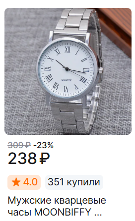 >>1902098 Понимаю, хорошие китайские часы в стальных корпусах и с нормальным механизмом начинаются примерно от 3к (в пластике дешевле), но дело в том, что среди них не нашлось ничего настолько же уебански выглядящего, поэтому пришлось шерстить двухбаксовый сегмент.