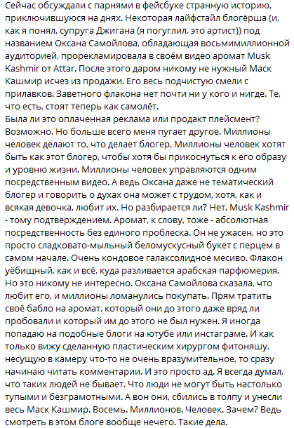 Давай объясню тебе на более простом языке. Ты не купишь маск кашмир потому, что его зафорсили в инстаграме среди пёзд и плебса, а я не куплю его потому, что мне не интересны подобные мономускусные профили. Понимаешь, в чём разница?
