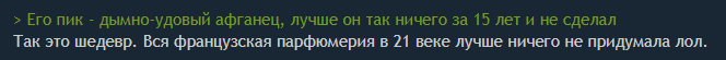 Это ведь какой-то форс, который вышел из-под контроля? Да, за потешные деньги ты получешь неплохой фраг, но запах реально НА ЛЮБИТЕЛЯ. Я вообще тянке дал понюхать, она сказала, мол, похоже на спрей от комаров. Стойкость у него, кстати, приемлемая - часа 2-3 точно с учетом того, что я всего пару пшиков сделал, и уж точно не 10 минут, как тут писал один анон.