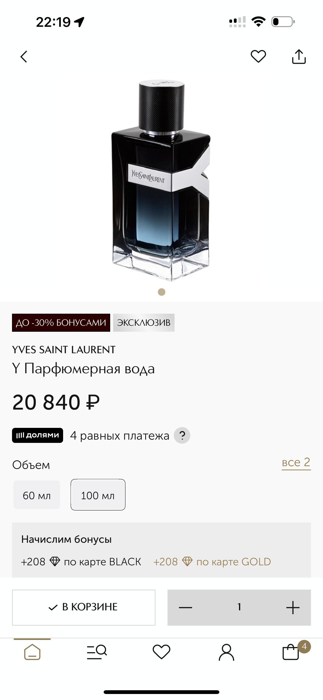 Я чето пропустил или с какого перепуга сотка Y EDP стоит на 5к дороже чем 150 мл колба диора? Да даже хрен с ним если бонусы списать (которых тут насыпают 1% от стоимости покупки и 5к бонусов - это на 50к купить надо) - будет сотка Y EDP = 150 Dior Че они о себе возомнили? YSL - это всегда был бренд на одну ступень ниже диора с шанель. Это бренд уровня живанши, не более того. Но их вонючки стоят дороже всех в люксе Да если хорошо поискать, то за 20к и авентус можно поймать