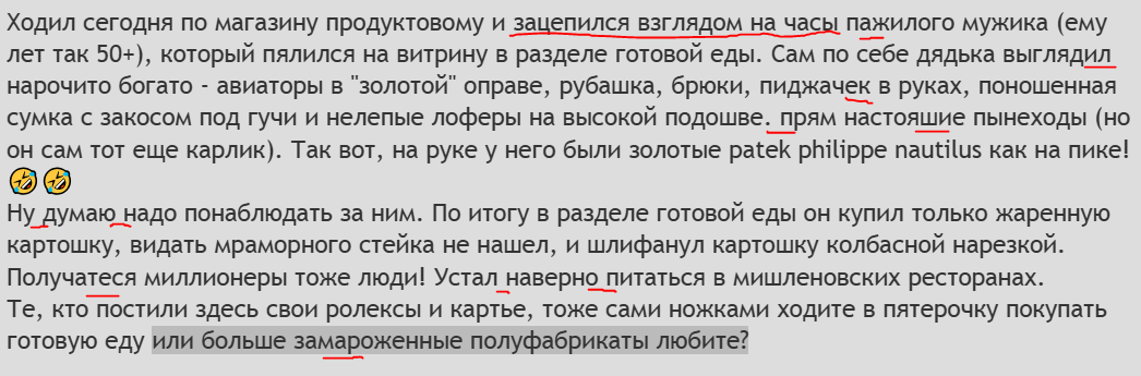 >>1910960 В том, что дорогие часы дорогие не потому, что технологичны и сделаны из редкосплавных материалов, а потому что производитель намеренно накручивает на них стоимость, зная, что статусодефицитные (заранее извиняюсь за это слово, употребляю впервые, так как только недавно осознал его значение), готовы тратить огромные деньги за побрякушку лишь для того, чтобы доказать другим, что они чего-то достигли в жизни. Если уж говорить про валидный статус успешного человека, то такому впору иметь что-то в виде пикрелейтед - штучный экземпляр, который действительно является произведением искусства, а не масс маркетом под соусом люксури.