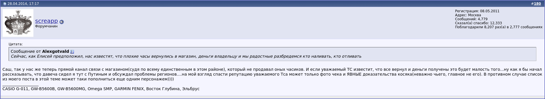 ТС купил часы и сам остался ими очень доволен. И подошли хорошо и вообще красивы как не глянь, поделился радостью с форумчанами, которые кинулись на перегонки поздравлять с покупкой хвалить и завидовать, а некоторые уже готовы были тут же их выкупить себе - все счастливы. Но только до тех пор пока не обнаружилось, что цифра "2" не так загнута как должна бы. И всё сразу изменилось - белое стало черным, достоинства недостатками, часы перестали радовать, хотя остались точно теми же самыми, что и были с самого начала и идут также точно как и шли и сидят на руке так же как и раньше, но до этого уже нет никому никакого дела. Да и кому тут вообще интересны сами часы?