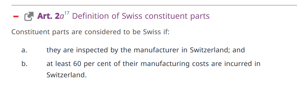>>1913835 >У ролекс вообще не видел запчастей произведенных вне швейцарии Логично - деталь считается сделанной швейцарами, если в ней 60% затрат на себестоимости сделаны швейцарами. Можно сделать хоть в Бурунди и считать сделанным швейцарами, разница в стоимости труда позволяет. И это не я придумал такие условия, это сами швейцары придумали.