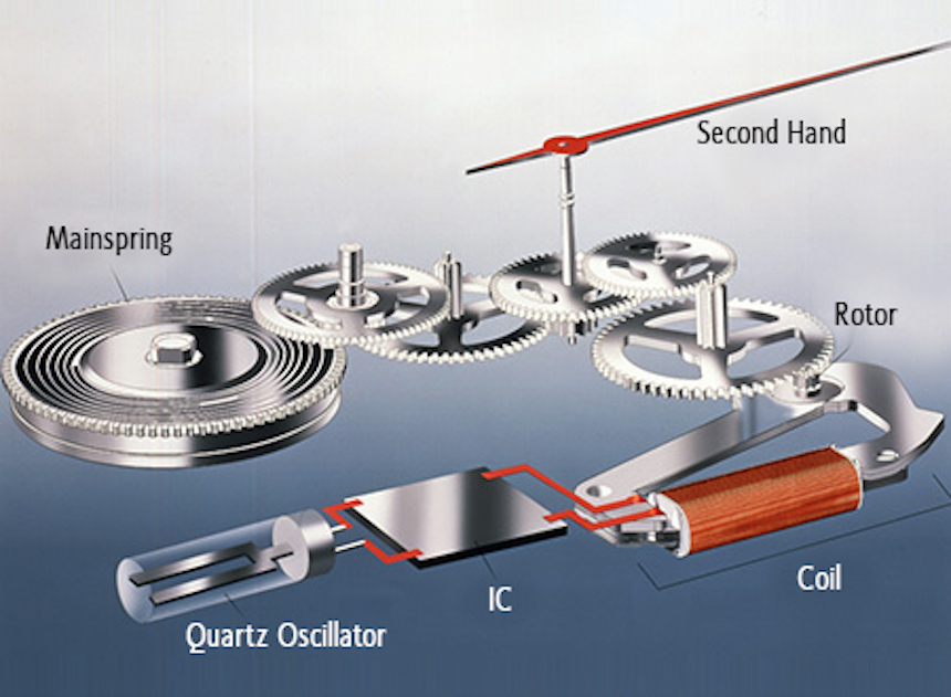 Spring Drive (Seiko) Уникальная и высокотехнологичная разработка Seiko. Источник энергии здесь — традиционная заводная пружина (с ручным или автоподзаводом). Однако вместо механического спускового регулятора (баланс-спираль) используется электронный регулятор скорости. Специальный три-синхро регулятор "считывает" скорость раскручивания пружины с помощью кварцевого генератора и управляет электромагнитным тормозом, обеспечивая невероятную точность. Это обеспечивает уникальное плавное скольжение секундной стрелки без скачков и точность до ±1 секунды в сутки.