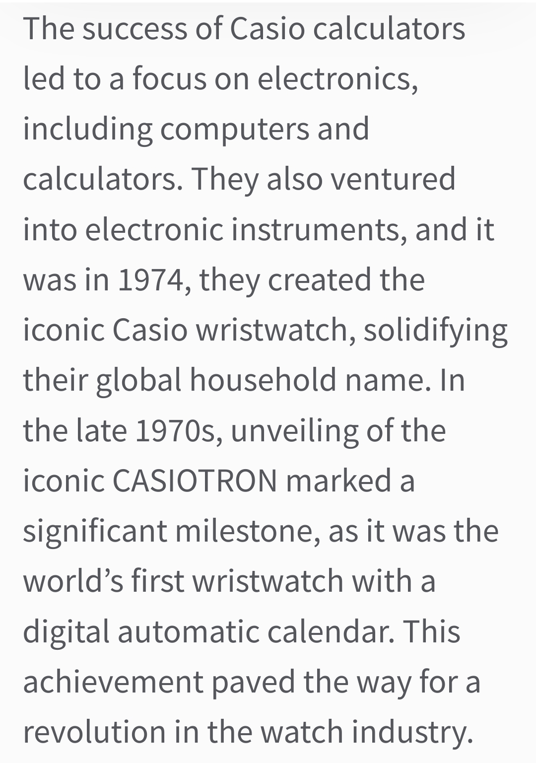 >>1927110 >Принеси калькулятор Вот. Я тебе ещё и ситизенов принесу. И делали они их раньше сасии, манюнь. >аналог протрека/жишока Жишоки это сасийная стезя, тут спору нет. А альтернатива протрекам - ситизен промастер. Такие же уродливые, но зато действительно прогрессивные. >На, читай, просвещайся. Прочитал. Где тут о великом вкладе, который швиссов на колени ставит? Касиотрон первые цифровые часы с календарём, не более. Первые цифровые на LCD-экране были у сейки за год до сасиотрона, а первые цифровые вообще гомильтоны сделали. Соляру сасия не придумала, первые часы с солярой были у Ситизенов в 76-ом. Где тут о технологиях и выдающемся дезигне, мань? >И с чего вдруг ты сравниваешь с Японией? А ты запрещаешь? Или неудобно получается? >Речь шла про швейцарский шлакобренды Нет, не шла. Да и зачем о них говорить, если это шлакобренды по низу рынка, которые никому не интересны? Против такого говна удобно перемогать, безусловно, но давай всё же будем сравнивать с сородичами.