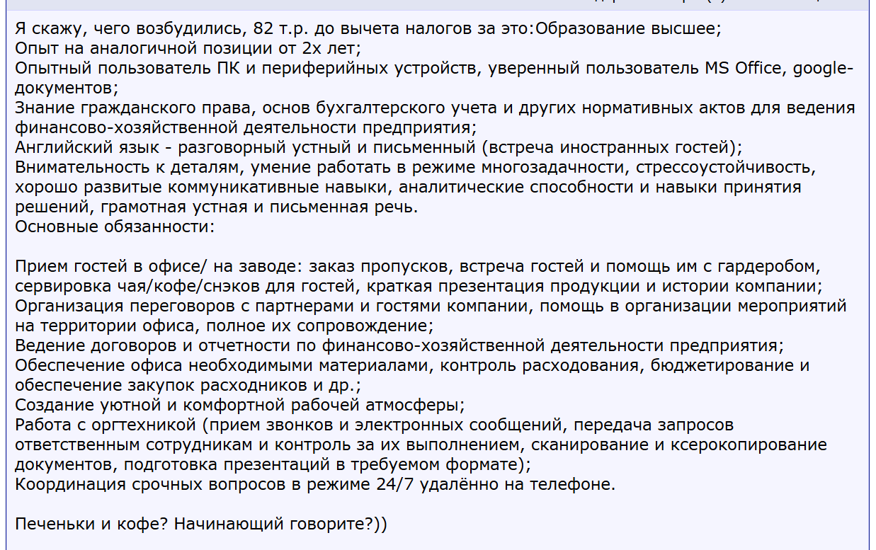 Свободный американский + пиэй 24/7 по нынешним расценкам 400-500 только за работу, без повышающих коэффициентов за длину ног. 80к было когда какетозник еще в подгузник тугосерил. Нагружать пиэй компетенциями департамента маркетинга, гражданским правом, бухучетом и "ведения финансово-хозяйственной деятельности" - колхозная дурка, без вариантов. Весь набитый дебсами, абсолютно весь, Какетозный госпиталь в этом мире есть Неудивительно что граф Полье побросал к хуям какеты и сбежал, прихватив иконы и бабки. Последний вменяемый покинул юдоль халтуры.