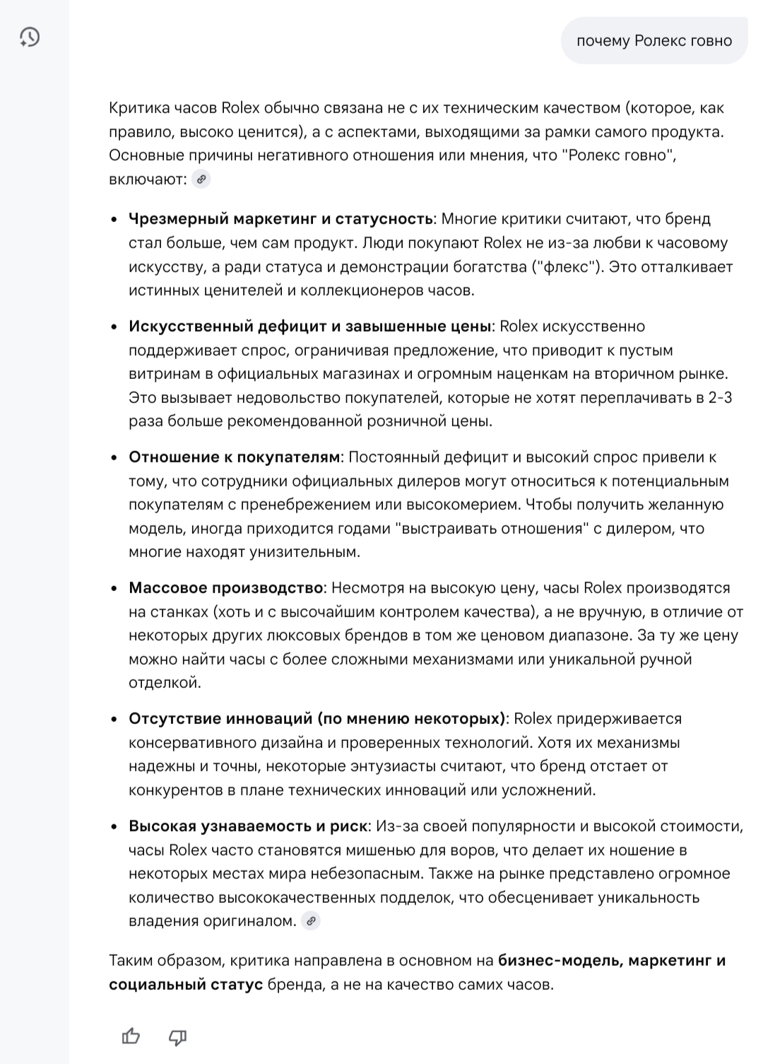 >>1945329 Угар. Я, конечно, не тот анон и как минимум не имею ни одних часов с алика, но тот анончик-таки прав. Грубо говоря в 70-е японцы, научившись делать массовый и дешевый кварц стали завоевывать позиции на рынке часов, гномы решили положить на это дело болт, не веря, что бОльшая часть обычных людей выберет низкую стоимость и простоту эксплуатации, вместо баек про гномичьи традиции и душу механики, лел. В 80-е наступил закономерный итог - абсолютное большинство швейцарских производителей часов оказались разорены и собстна скуплены различными корпорациями - сватч групп, ричмонт итд. Собстна очень смешно слышать сказки про традиции, гномов и превосходство швисов, зная этот факт. Буквально одинаковые часы с разными шкильдиками и разным ценником, построенные на одних и тех же мехах с искусственно созданной конкуренцией между собой и иллюзией выбора. И это мы не говорим про тот факт, что для шкильдика швисс мейд хватит поставить швисский механизм и окончательно собрать в подвале Цюриха, остальное закупив у пакистанцев. Почему-то, когда так делают в России сразу поднимается вонища про аналоговнет, налепили шкильдик etc Конечно есть мануфактурная швейцария, но следует понимать, что это во многом это опять-таки спекуляция купленным в 80-е именем и традициями той самой первоначальной марки и не пахнет Ну как сбербанк, ведущий свою историю с 1856 года.. Ну и ценник за такие мануфактуры просят соответствующий и типичный анон может про них забыть. И это мы не говорим про то, что гномы так и не смогли освоить на должном уровне кварц, он у них всратый буквально по всем пунктам, механика же часто с пластиковыми деталями и все сделано лишь бы заебать конченогоечного пользователя и заставить пользоваться исключительно фирменными сервисами. Тупорылая гномичья маркетинговая стратегия. Но гои рады, думая, что покупают историю, традиции и статус. Как-то так.