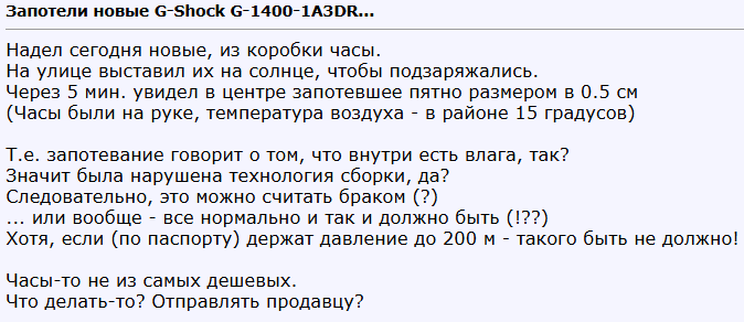>>1947798 Идиотизм. Слышал про такую вещь, как относительная влажность воздуха? Так вот ты от нее никуда не денешься при сборке. Как раз она является признаком герметичности часов. Полагаю, что шоки потеют чаще других часов по причине того, что у большинства пластиковый корпус, который менее теплопроводен, нежели металл.