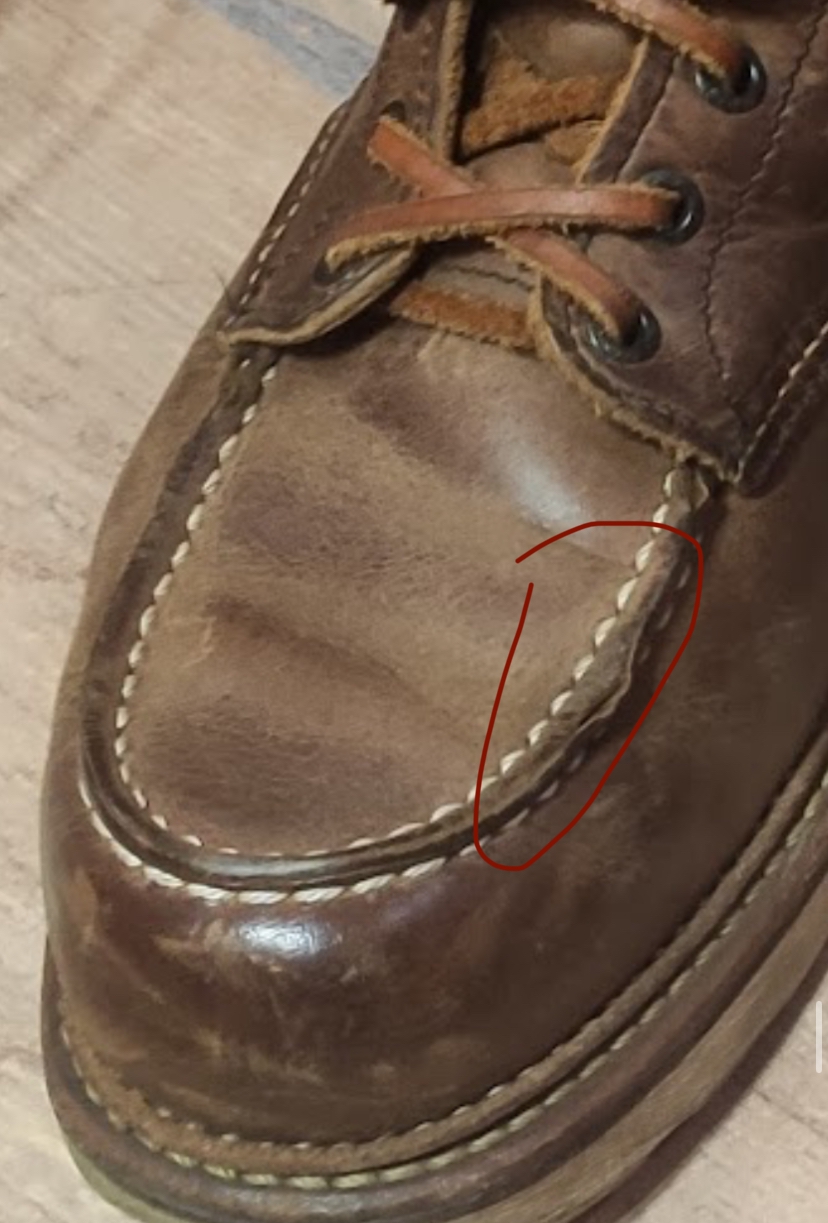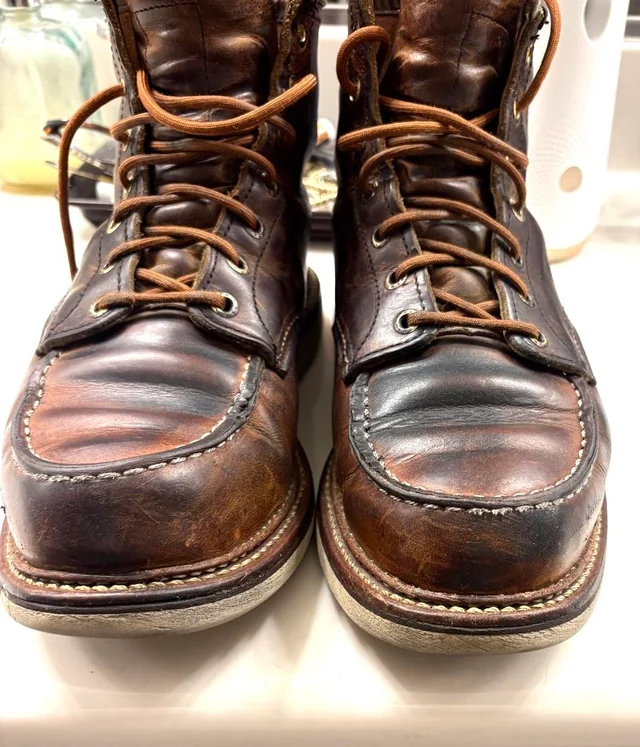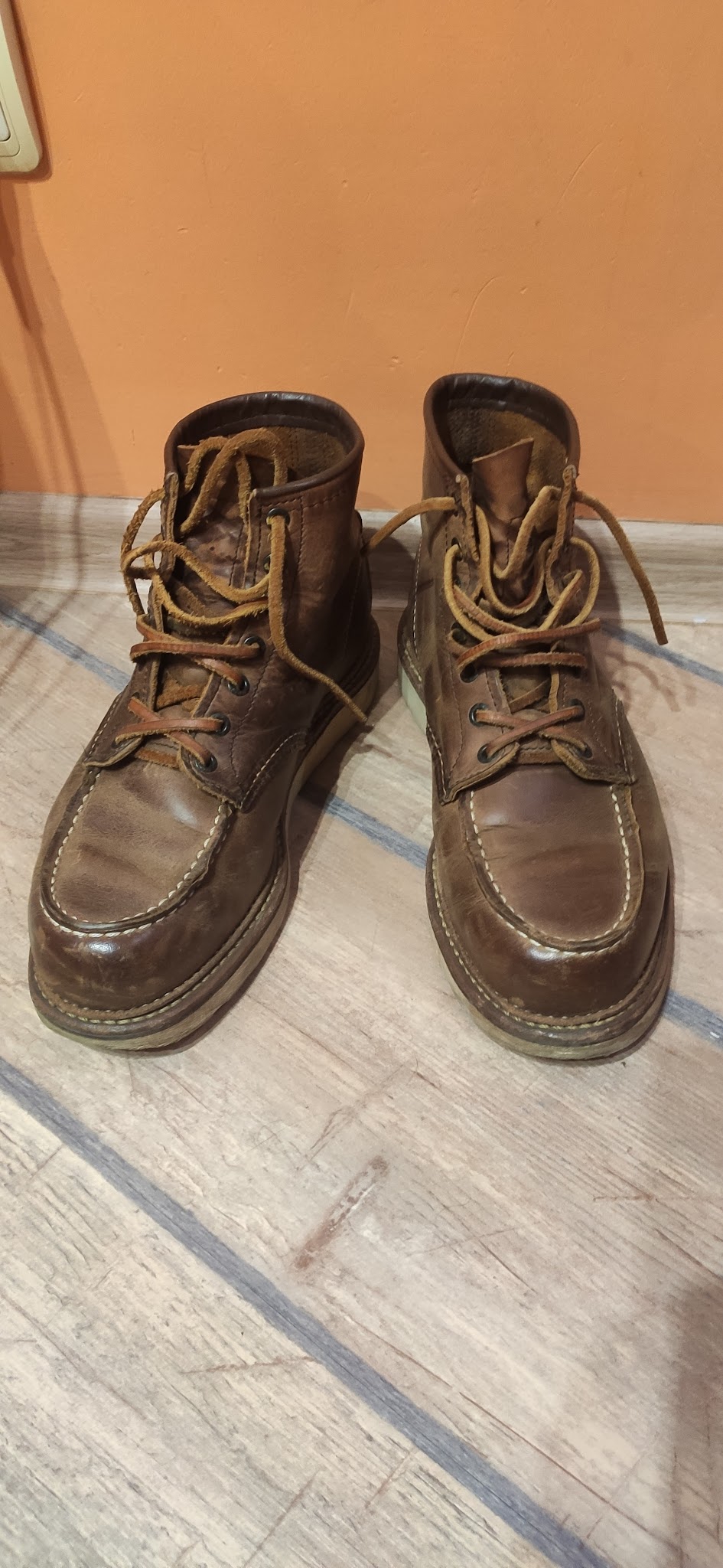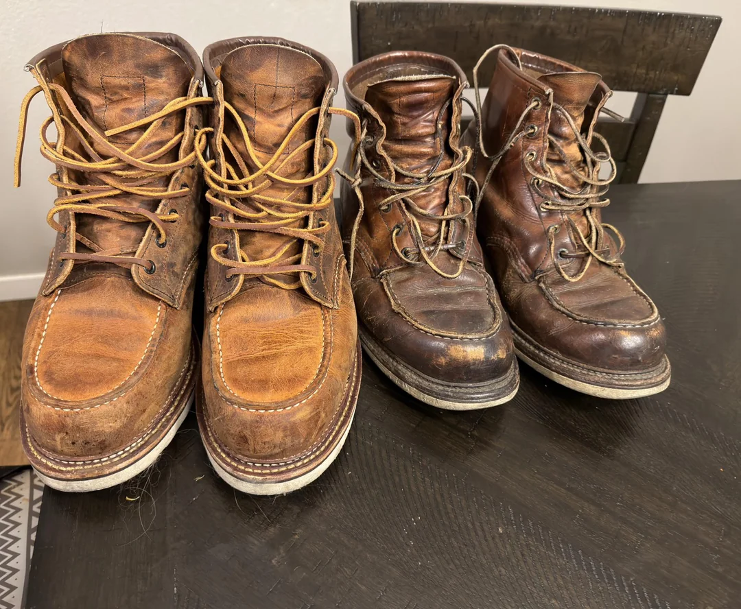 В 2023 захотелось себе моки в классическом силуэте, прошел стадии принятия Harry Hatchet -> BBR -> Ecco и понял, что надо брать исходный оригинал. На тот момент в сабже практически не шарил и решил остановиться на варианте покупки в ретейле (с возможностью возврата/сдачи по гарантии и уверенностью, что это не паль). 875/877 моделей (самый иконик) в моем размере в Code7 уже не было, а больше RW нигде в России не продаются (Code7 в свое время заполучили статус эксклюзивного дистрибьютора и пидорнули всех, кто пытался торговать без лицензии, а с началом войны RW пидорнули уже их самих и остановили поставки). Взял размер 8 US D, без примерки, ибо доставка из ДС2, со стельками оказались на полразмера малы, ношу без них. Разноска стандартная - пару дней на толстый носок по паре часов дома, потом пару недель толстый носок на улицу, ничего не натирали, проблемным местом оказалась окантовка - при ходьбе понемногу давила на ногу и в итоге доводила аж до синяков, хотя запаса было 2-3 пальца, прошло только месяца через 2. Подошва Traction Tread самая мягкая и удобная в херитейдж линейке (возможно, за исключением Atlas Tread у моделей Chukka/Wabasha), но это сказывается на износостойкости, особенно на пятке и носке, думаю, еще 2-3 года максимум и нужен будет ресол. На коцки не смотрите, после протирки мокрой тканью и последующей пропиткой кондиционером цвет выравнивается, я это делаю раз в год по весне, в остальное время просто чищу щеткой из конского волоса.