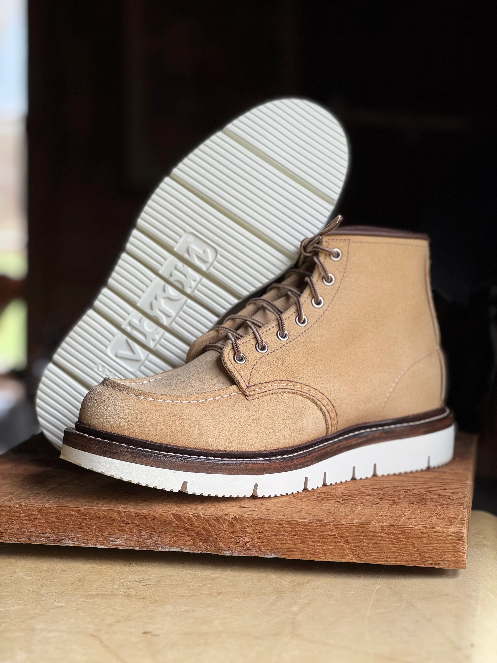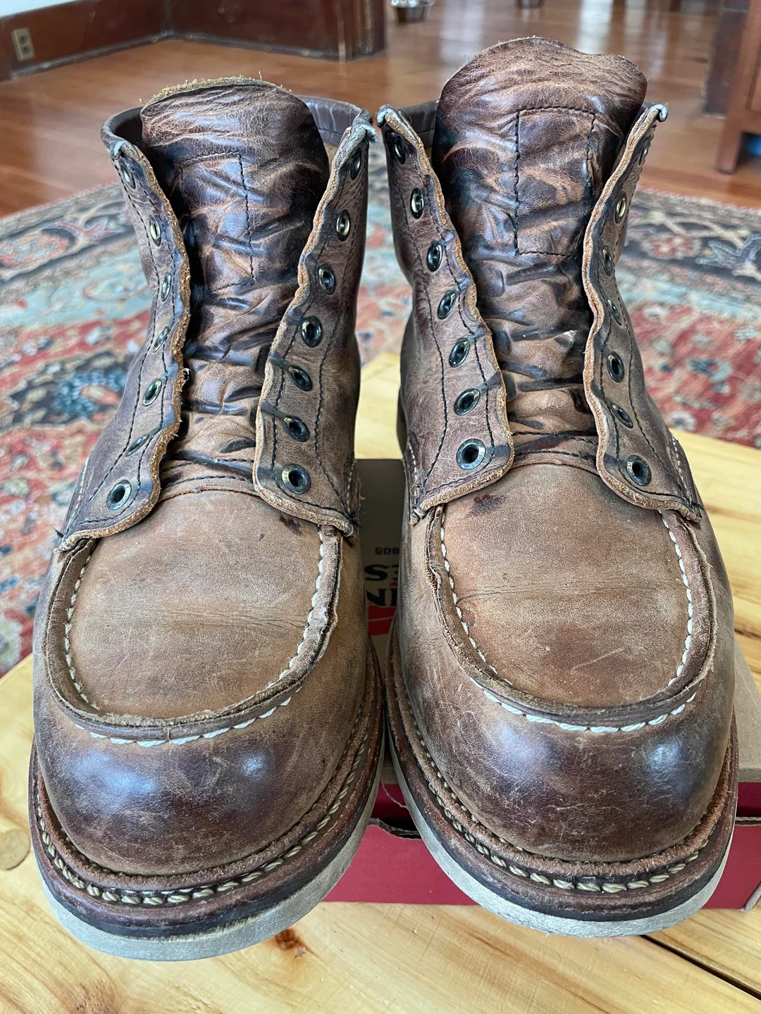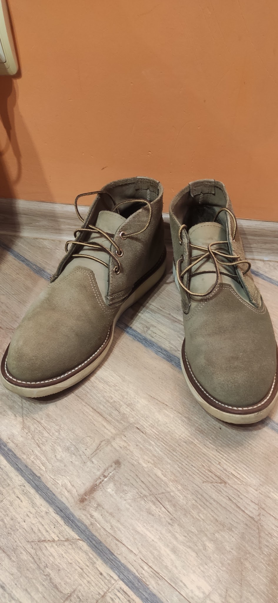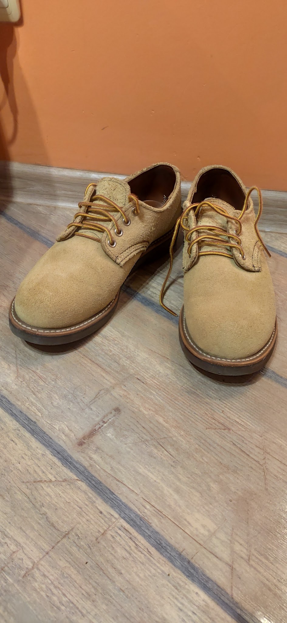 В 2023 захотелось себе моки в классическом силуэте, прошел стадии принятия Harry Hatchet -> BBR -> Ecco и понял, что надо брать исходный оригинал. На тот момент в сабже практически не шарил и решил остановиться на варианте покупки в ретейле (с возможностью возврата/сдачи по гарантии и уверенностью, что это не паль). 875/877 моделей (самый иконик) в моем размере в Code7 уже не было, а больше RW нигде в России не продаются (Code7 в свое время заполучили статус эксклюзивного дистрибьютора и пидорнули всех, кто пытался торговать без лицензии, а с началом войны RW пидорнули уже их самих и остановили поставки). Взял размер 8 US D, без примерки, ибо доставка из ДС2, со стельками оказались на полразмера малы, ношу без них. Разноска стандартная - пару дней на толстый носок по паре часов дома, потом пару недель толстый носок на улицу, ничего не натирали, проблемным местом оказалась окантовка - при ходьбе понемногу давила на ногу и в итоге доводила аж до синяков, хотя запаса было 2-3 пальца, прошло только месяца через 2. Подошва Traction Tread самая мягкая и удобная в херитейдж линейке (возможно, за исключением Atlas Tread у моделей Chukka/Wabasha), но это сказывается на износостойкости, особенно на пятке и носке, думаю, еще 2-3 года максимум и нужен будет ресол. На коцки не смотрите, после протирки мокрой тканью и последующей пропиткой кондиционером цвет выравнивается, я это делаю раз в год по весне, в остальное время просто чищу щеткой из конского волоса.