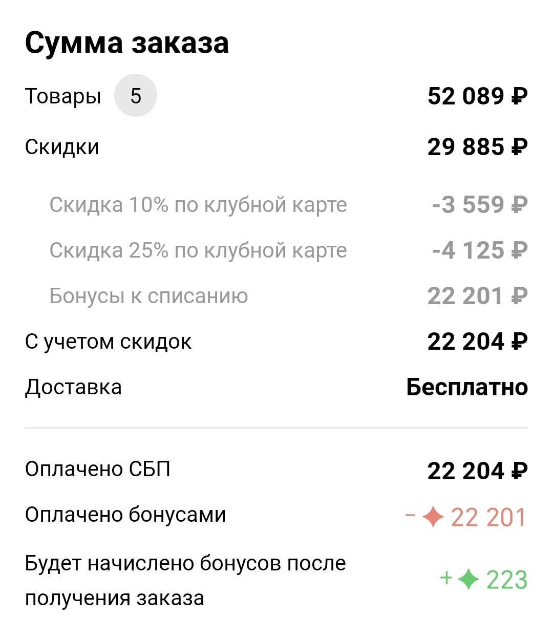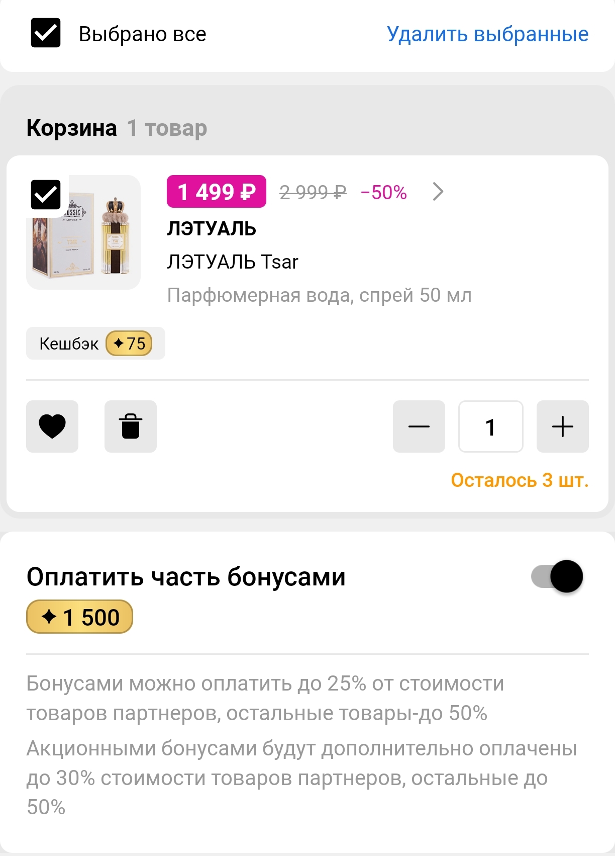 >>1946174 Почему 2700, ничего не понимаю. Вам настолько плевать на лишние 1500, что покупает по полной цене? И это при том, что в корзине само предлагает списать бонусы автоматом, когда добавляешь товар. Да и в магазине на кассе можно попросить списать бонусы, показав карту из приложения.