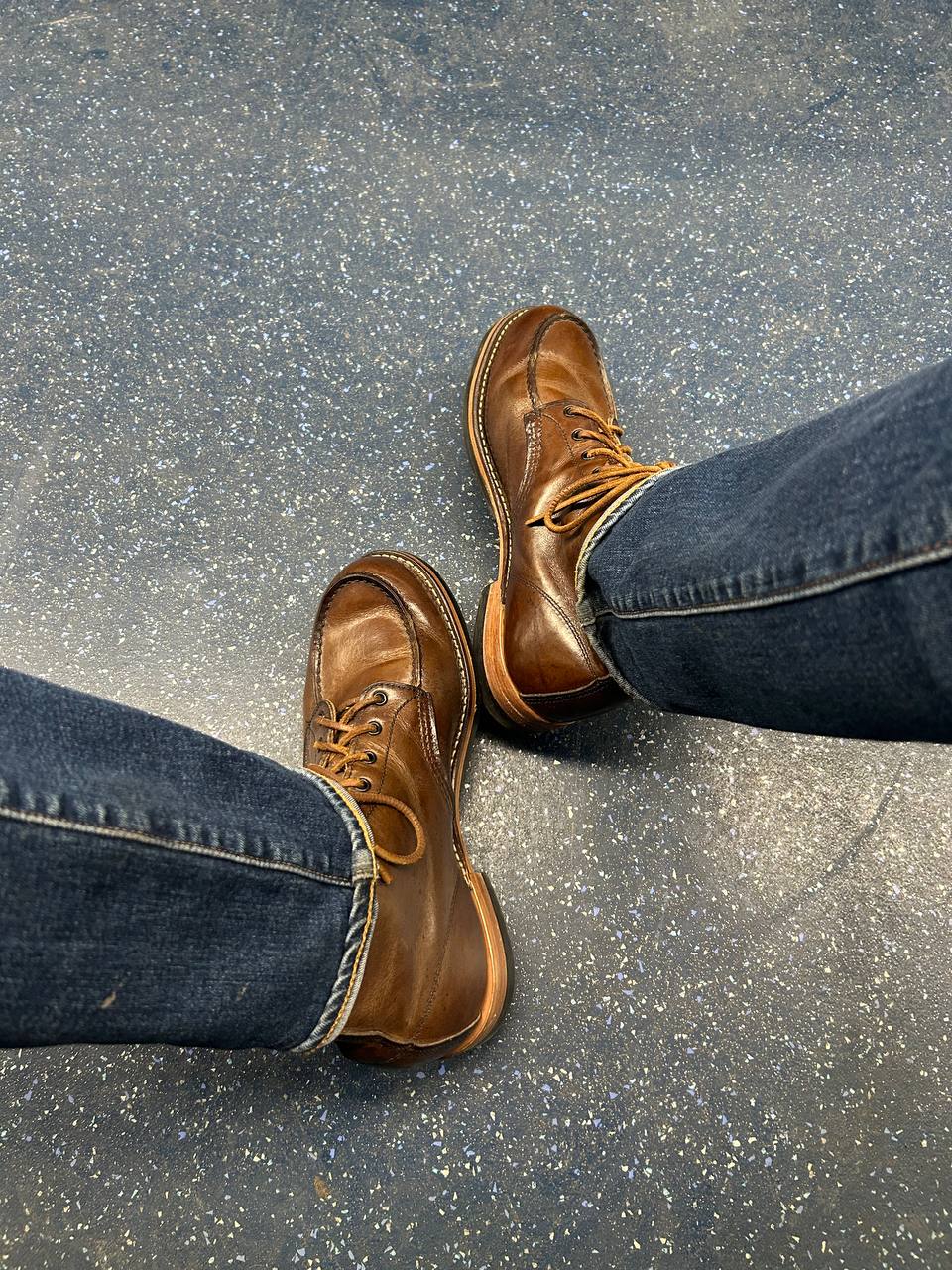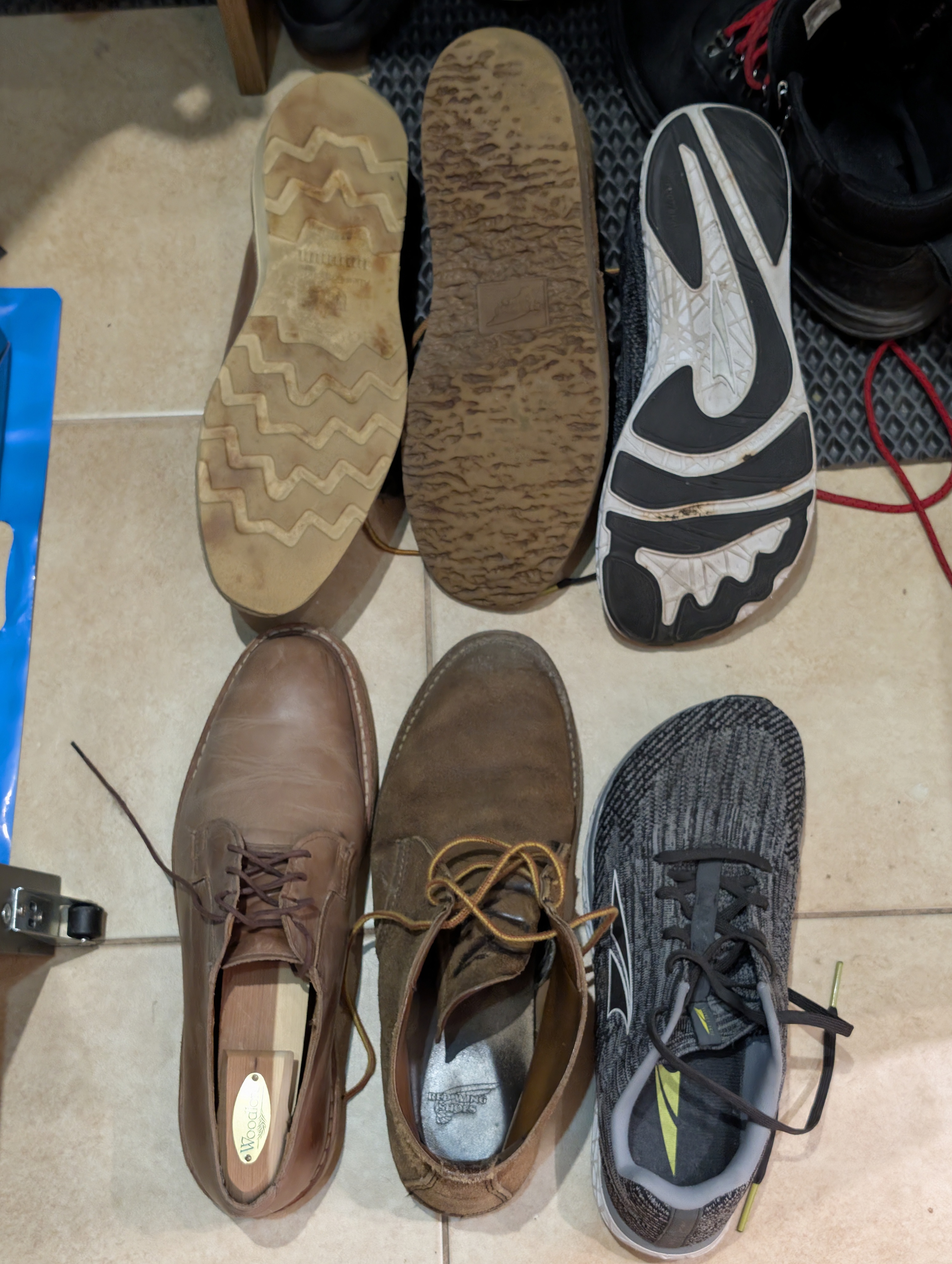Эти утиные лапы не сильно то удобные всё равно. Нормально только когда именно колодка широкая. Вот у меня как раз есть типичные узкие околотуфли, широкие боты и анатомичкеские кроссы. Кайфую только в средних, вон видно что стоптаны сильнее всего.