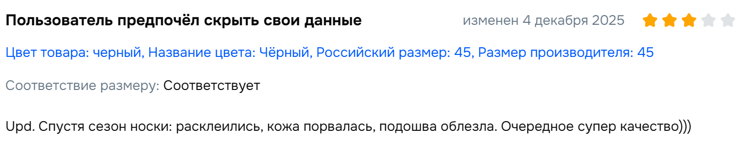 >>1954366 Чел, на дворе 2025-й год. 4-й год СВО, третий год активного санкционного режима, второй год проблем с серым импортом по причине личного распоряжения известно кого. Ты либо покупаешь что-то от 200 баксов у барыг или за границей через мейл форвардеров, либо перебираешь кривые российские поделия, которые раньше бы бомжи только надели, либо берешь китайский мусор и страдаешь. В совочке нормальная обувка стоила от 2/3 зарплаты программиста до 3-х зарплат, к этому и идем.