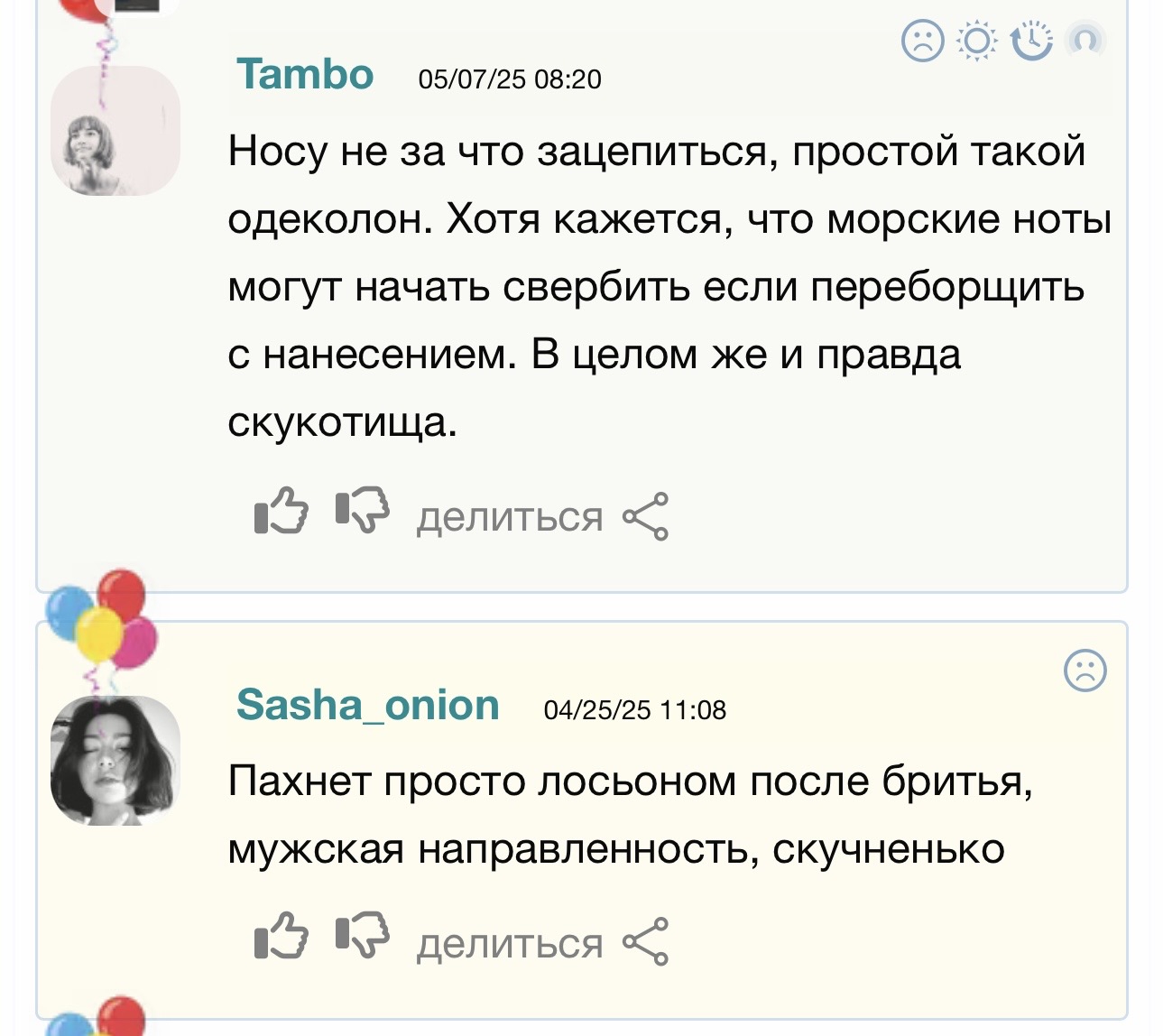 >>1954198 Относил флакон 001, на весну возьму ещё флакон. Простой приятный аромат на каждый день осень/весна, никого вокруг не задушит, окружающим нравится.