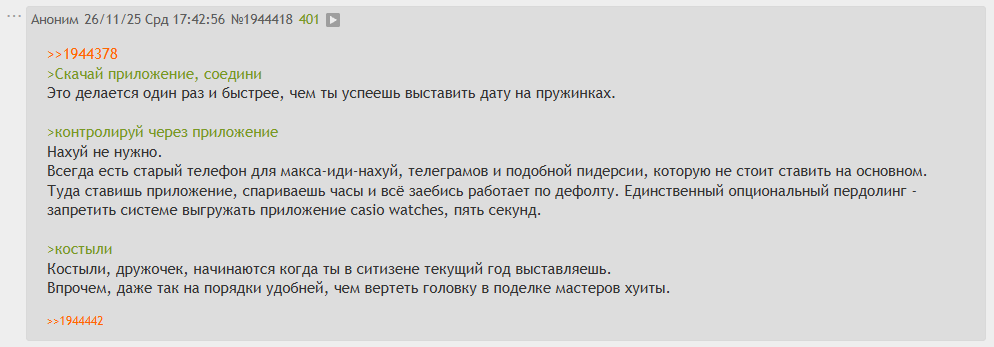 >>1956361 >такой же бред про 2 телефона для синхронизации Ах, если бы это был бред. Нет, увы, милостивый государь, это были слова апологета радисинхронизации и прогрессиста (того самого, которому невмоготу ставить смарт-часы на таблетку) о том, что он носит с собой два телефона: один для звонков, а другой для приложения Casio. И это очень удобно.