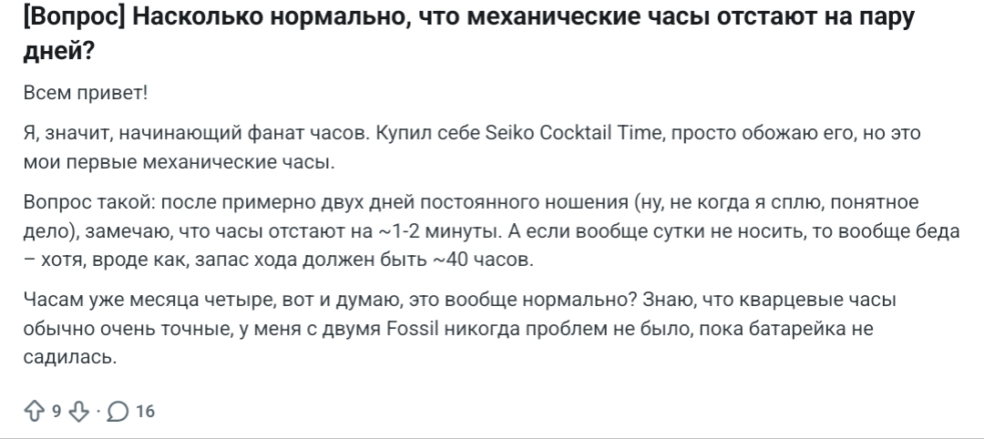Не, я вполне могу предположить, что была у тебя какая-нибудь всратая совковая механика на 2609НА, которая за древностью лет сыпалась от чиха, или уже упомянутый мной алишлак за тыщу рубликов с 17-каменным мехом, тут уже был один такой, всё ему ротор АПЗ в руку больно бил. Вопрос только в том, насколько у тебя развито мышление, раз ты делаешь выводы обо всех механических калибрах, попользовавшись некачественным шлаком из низшего сегмента.