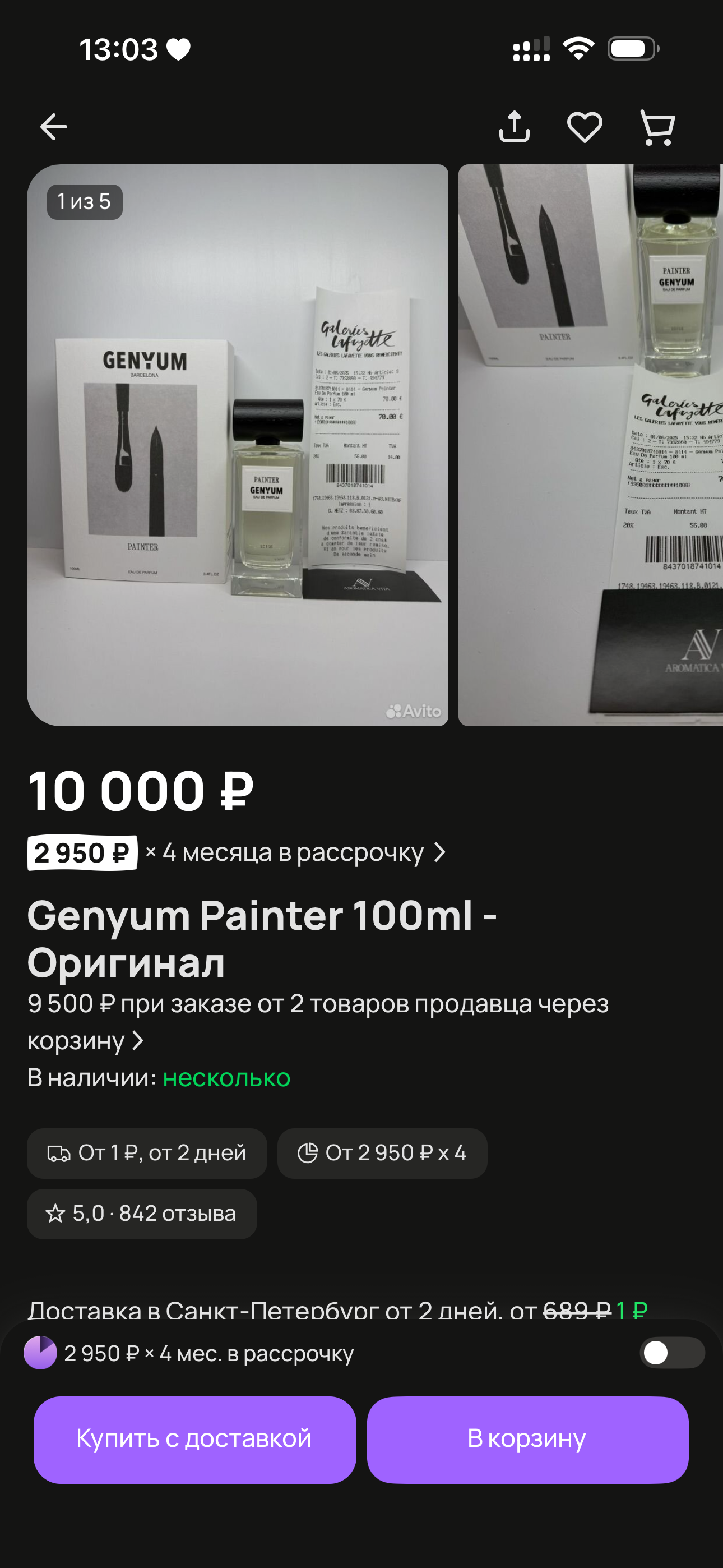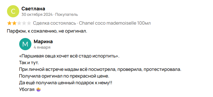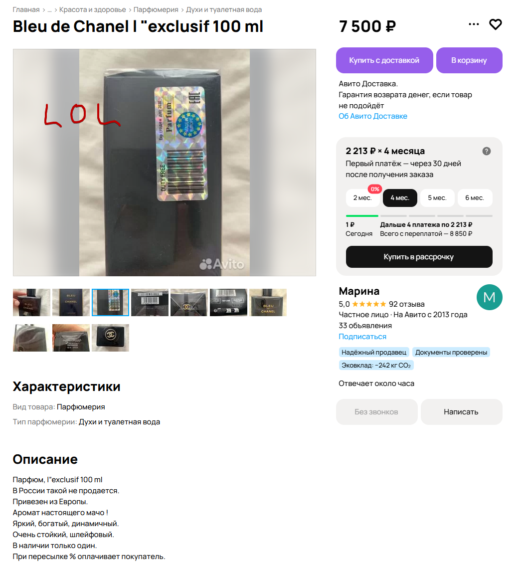 На Авито парф продают: 1. Либо под заказ те же барыги товара со Складочной. 2. Либо просто рандомные челы, которые продают несколько флаконов, которые они купили по скидкам/не зашло.