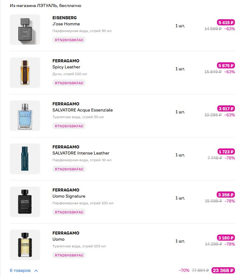 >>1959669 Кстати, о Летуале с их 50К праздничных баллов, заметил, чем больше в одной корзине покупаешь, тем больше проходят скидки (ну до исчерпания баллов, естественно). Ну и что думаете о феррагамо? Пойду сегодня тестить, за такую цену не очень жалко будет, если середняки.